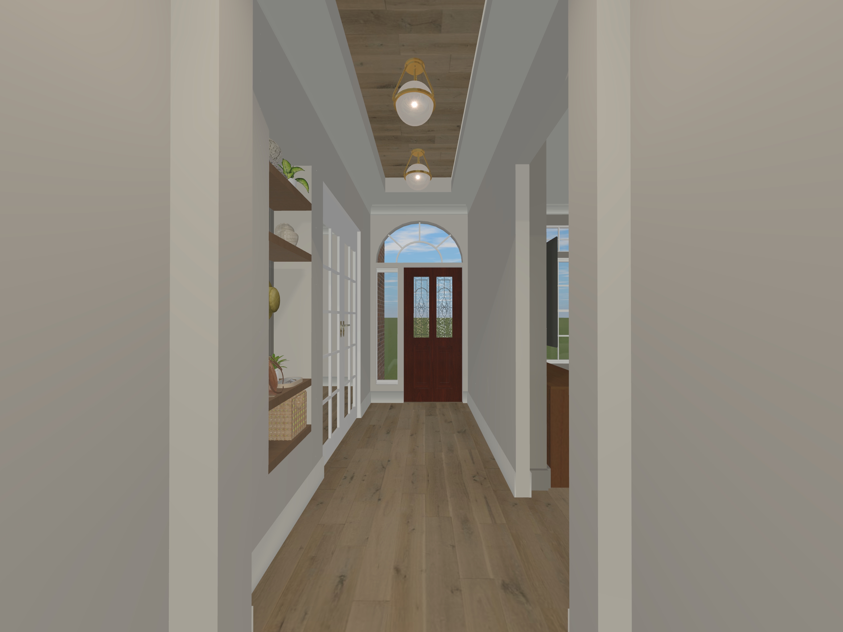 add door lever hardware on the left side of door add artwork on the wall to the right add white shutters on the sidelight window to the left of the door