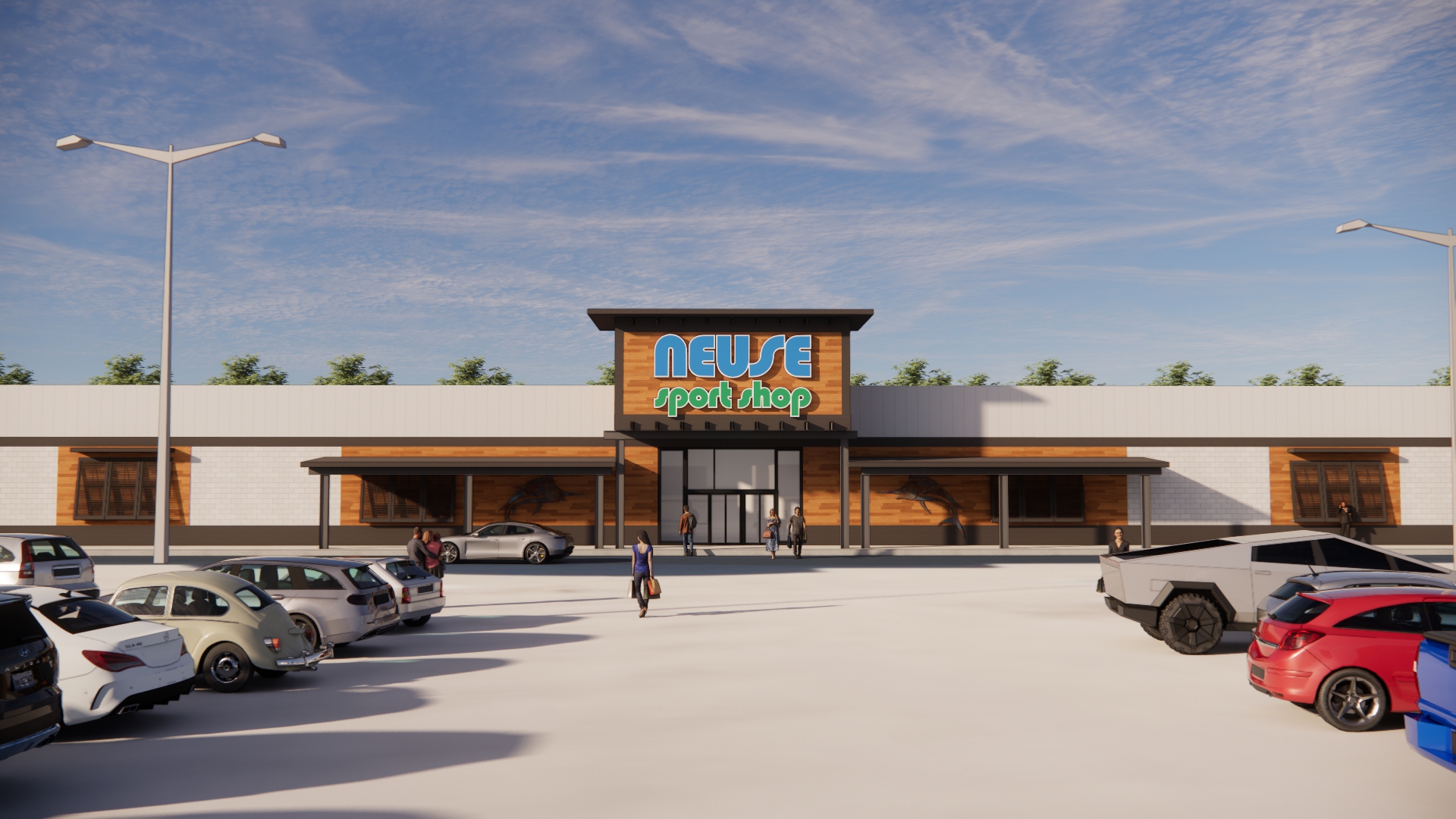 night sky christmas lights along roof line christmas lights along walkway roofline no windows behind shutters down light on awning above shutters turn parking lot lights on wet black asphalt parking lot colored christmas lights wrapped around columns