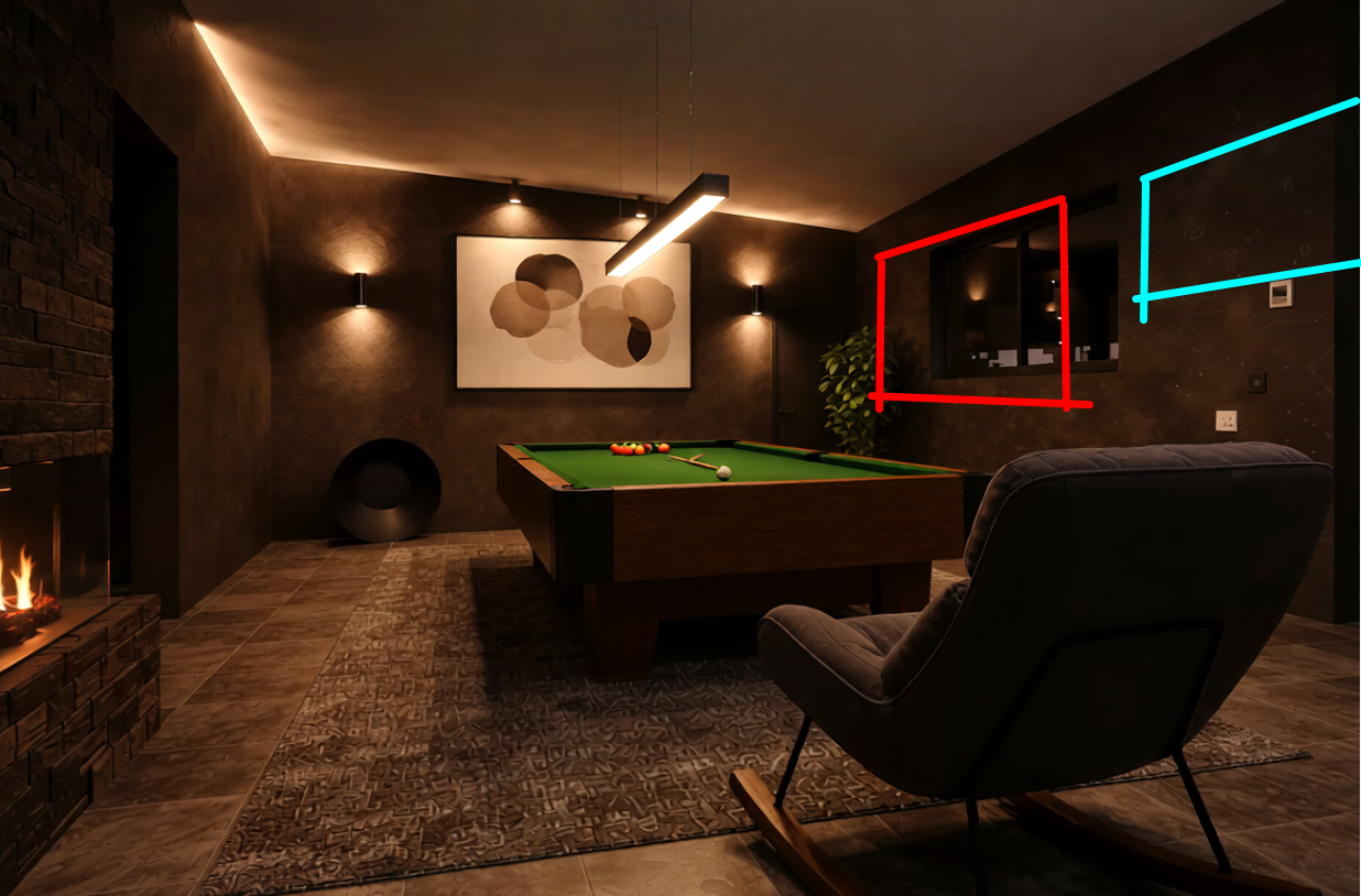 modernist exterior shot tv in red area and window in blue area architecture