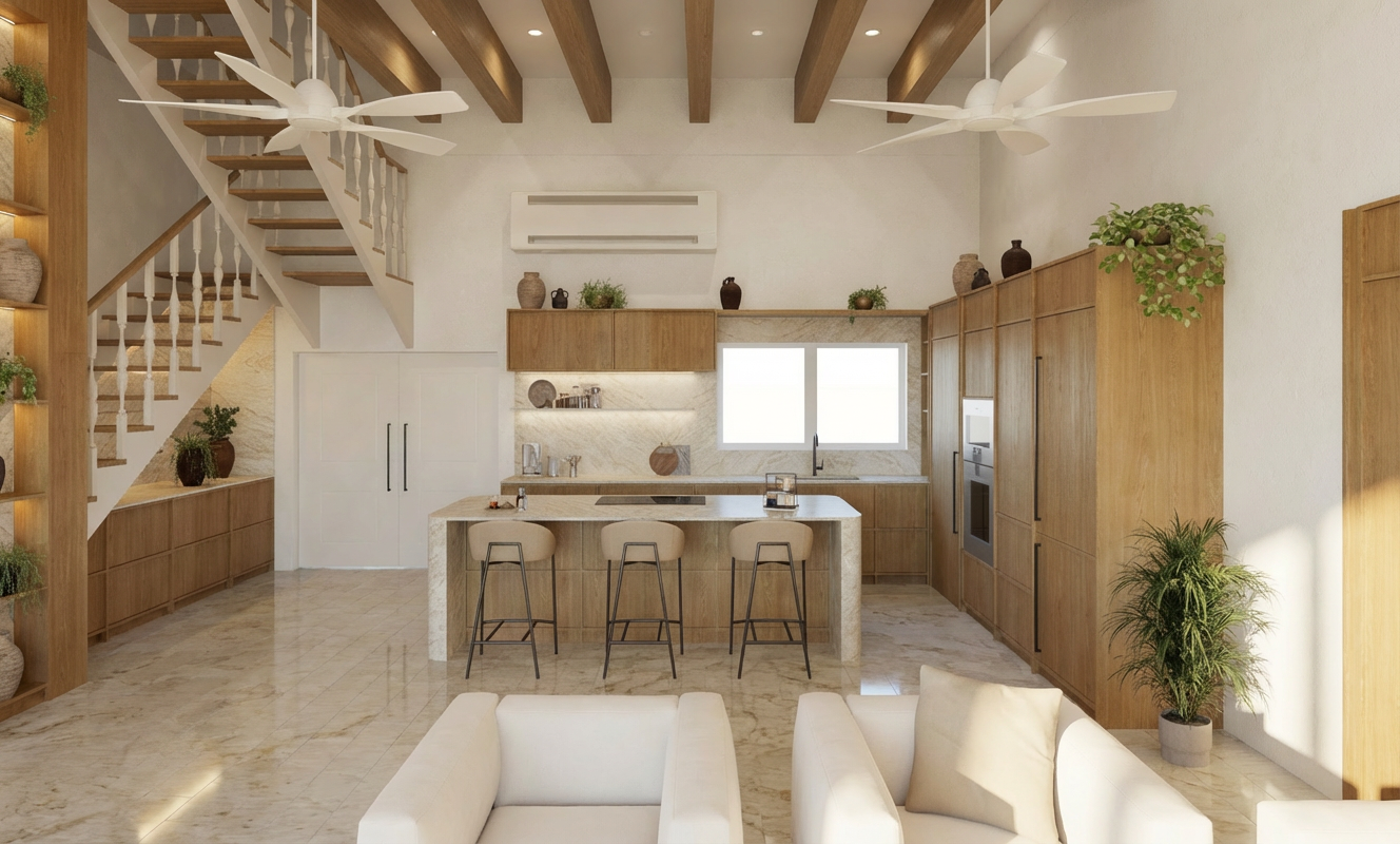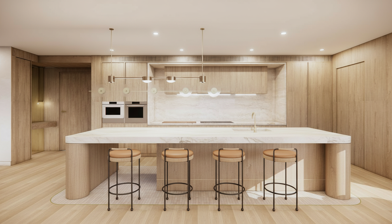 add mid centuary modern wabi sabi modern modern folk stylinmg elements to this penthouse kitchen do not change origional design or any proportions dont add any new pendants all i want to do is warm up this kitchen a bit with these elements add these bar stools too only to the left side of the island