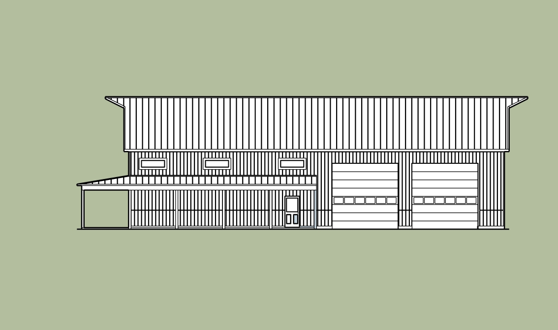 a modern two story polebarn with white vertical board and batten siding black vertical board and batten siding wainscoting black standing seam metal roofing black doors black windows natural timber posts supporting the half length covered porch retain the exact structure window arrangement patio columns rooflines foundation height and proportions exactly as shown in the reference image add a smooth concrete front driveway extending toward the house integrated naturally into the sloped terrain surround the property with a lush dense forest of tall mixed evergreens and hardwoods place the sun behind the trees so warm golden sunlight beams through the branches casting soft rays and subtle dappled highlights across the patio siding and grass create ultra realistic lighting crisp shadows detailed textures in the wood siding and glass reflections and a vibrant clear sky with light atmospheric depth render in hyper realistic architectural visualization quality 8k resolution