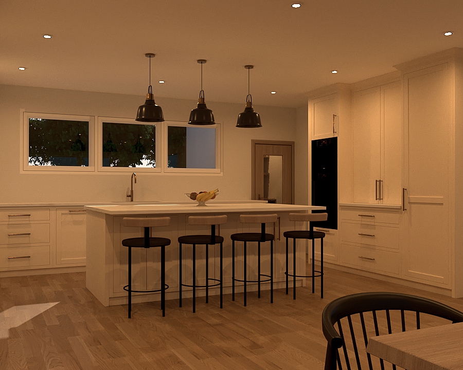 render a modern kitchen interior with a warm cozy atmosphere the cabinets and walls are painted in a soft creamy white the island is topped with a sleek white countertop accompanied by four black metal bar stools with circular seats above the island three black industrial pendant lights hang casting a soft glow the floor is a light natural wood enhancing the cozy ambiance through the windows a view of lush greenery is visible adding a touch of nature the room is subtly illuminated with recessed ceiling lights creating an inviting and harmonious space