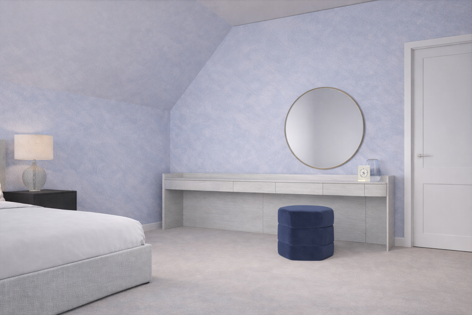 add a blue throw on bed add decoration on the dressing table maybe a laptop in the corner and make up stuff on the right make the mirror 1 3 times bigger add a handbag near the pouff