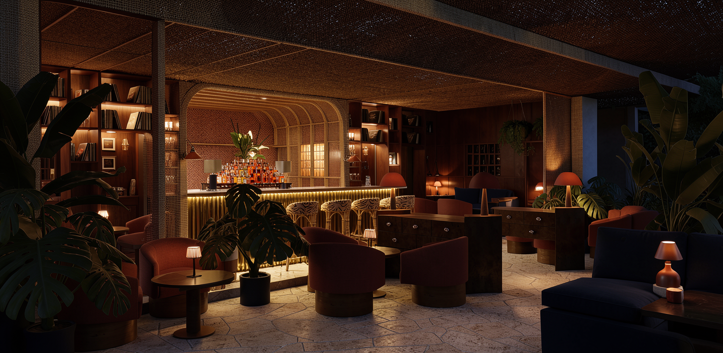 create a cozy elegant indoor outdoor evening speakeasy bar with an intimate atmosphere with a focus on rich warm colors the walls are adorned with a deep mahogany wood lacquered finish complemented by warmly lit shelves filled with vinyl and glassware the bar counter is reflective brass that catches the light the rum bottles glow and the the room has a soft glow of amber mimicking the rum bottles the floor is a textured limestone and the bar is lined with contrasting bamboo stools exuding a comfortable charm around the bar is the same textured raffia weave surrounding the walls and archway plants add a touch of tropical greenery while soft ambient lighting casts a warm inviting glow throughout the space the ceiling is a textured dark brown raffia weave enhancing the intimate atmosphere upholstered linen chairs in dark terracotta tones are arranged around dark wooden tables navy blue sofas and table lamp bases rust toned table lamps completing the sophisticated decor create a serene and welcoming atmosphere with an emphasis on luxury and comfort the night sky is above with stars the console tables are burl wood and the chairs are navy blue there is a light glow throughout the terrace