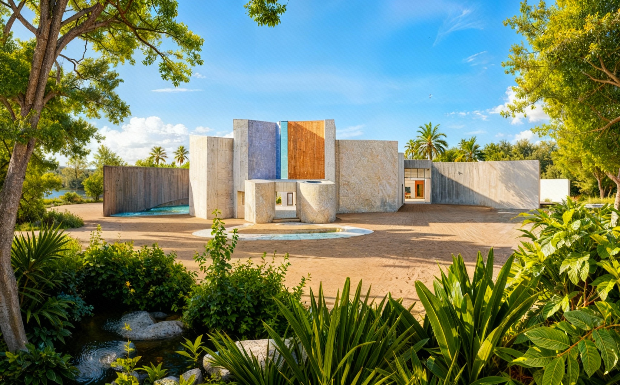 will you create a realistic photograph with a sunburst behind the house white painted brick creamy stucco and creamy white vertical board and batten