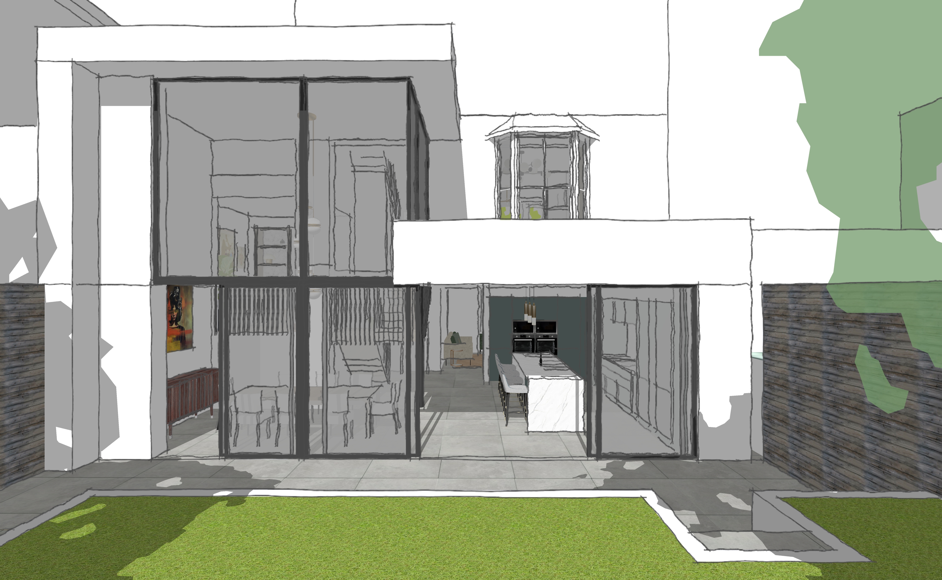 rear modern extension to a victorian london brick home warm white render with large format glazing view into kitchen and dining area garden grass with modest low planting in the foreground soft evening light