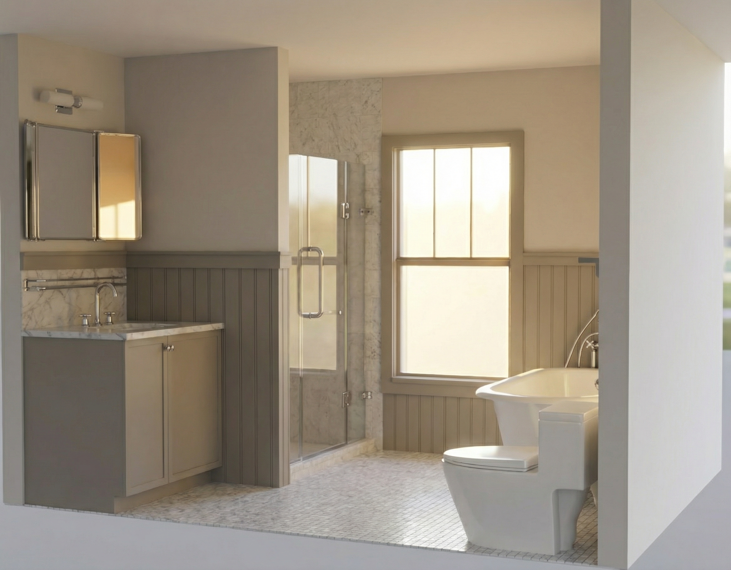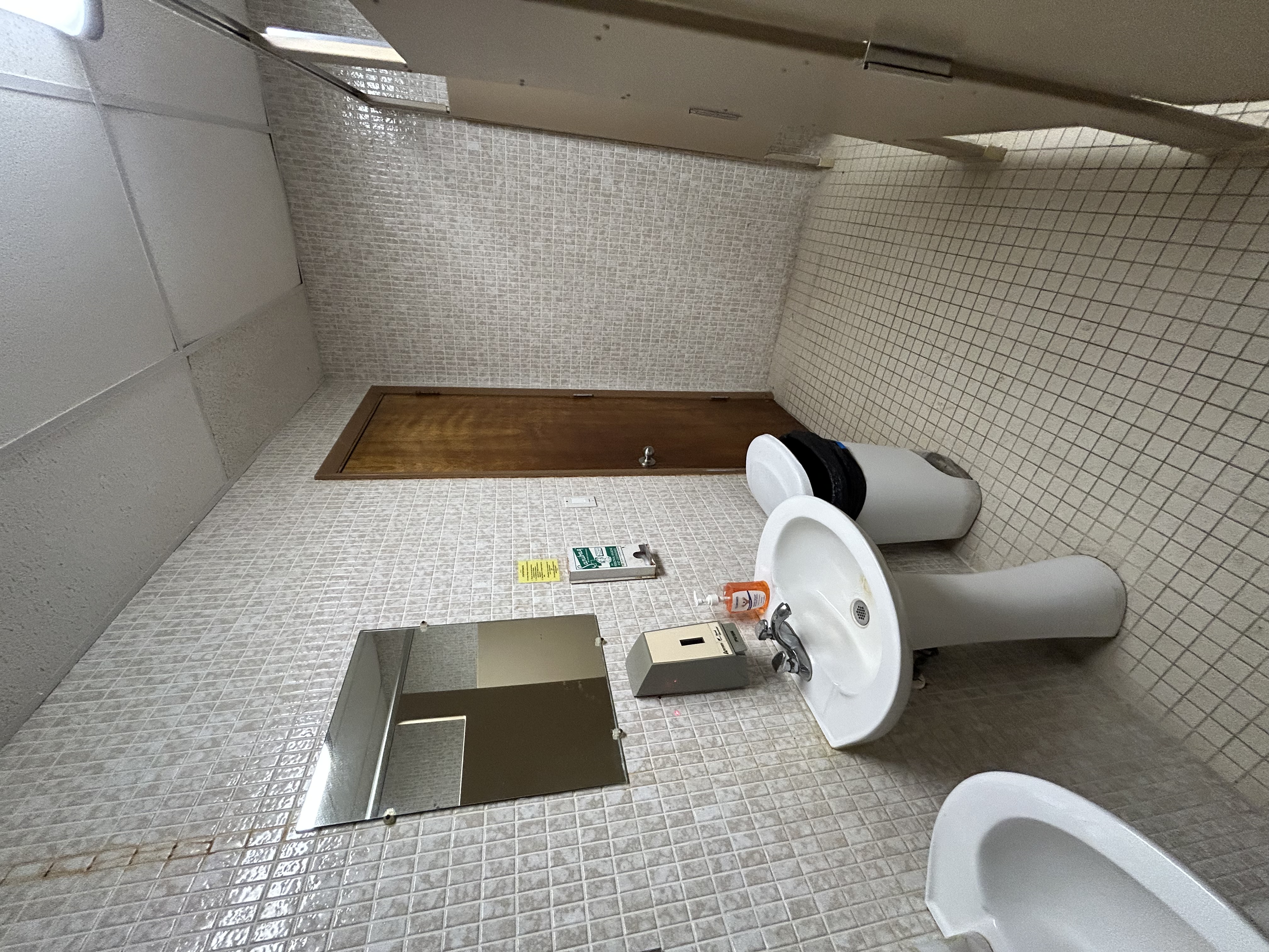 add wall mounted sink black and white checkered floor white subway wall tile black entry door black partitions