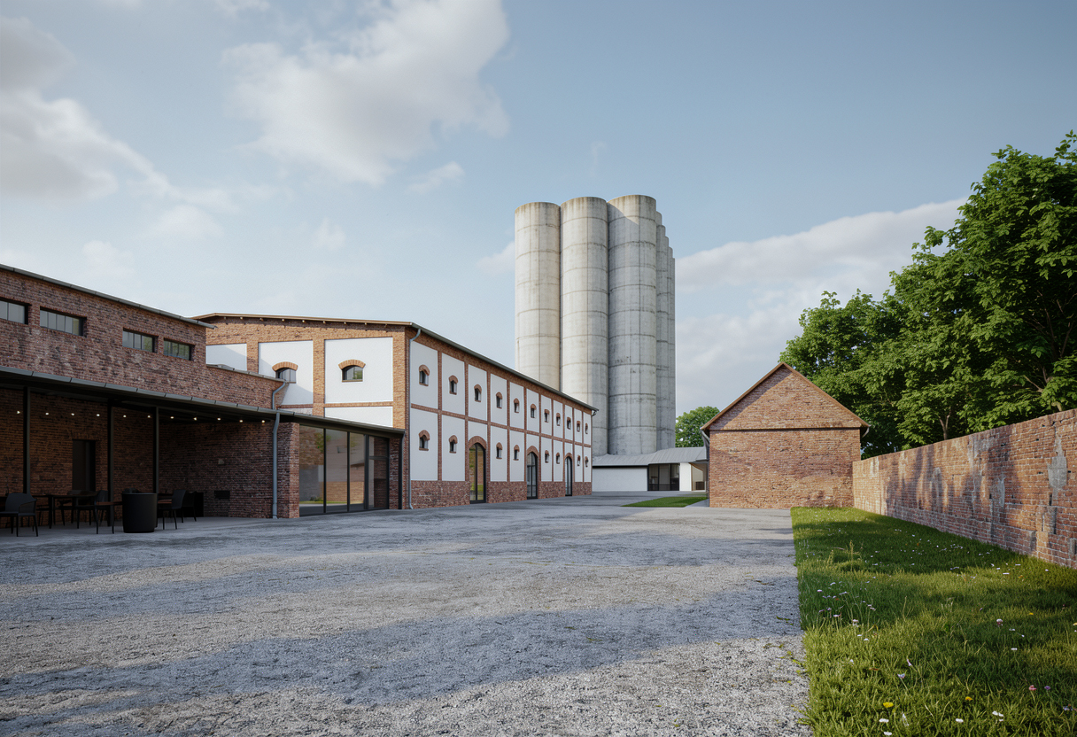 cinematic hyper realistic 4k video a group of diverse people standing in a circle in a sunny industrial courtyard with red brick walls engaged in a lively and natural conversation the characters are highly detailed with lifelike skin textures realistic facial expressions and natural eye movements a middle aged man in a dark jacket is gesturing warmly while speaking and a woman next to him is smiling holding a glass in the background other people are softly blurred sitting at tables under a canopy the camera performs a slow smooth handheld pan around the group soft natural daylight creates realistic shadows on the gravel ground subtle movements hair swaying in a light breeze blinking and authentic body language