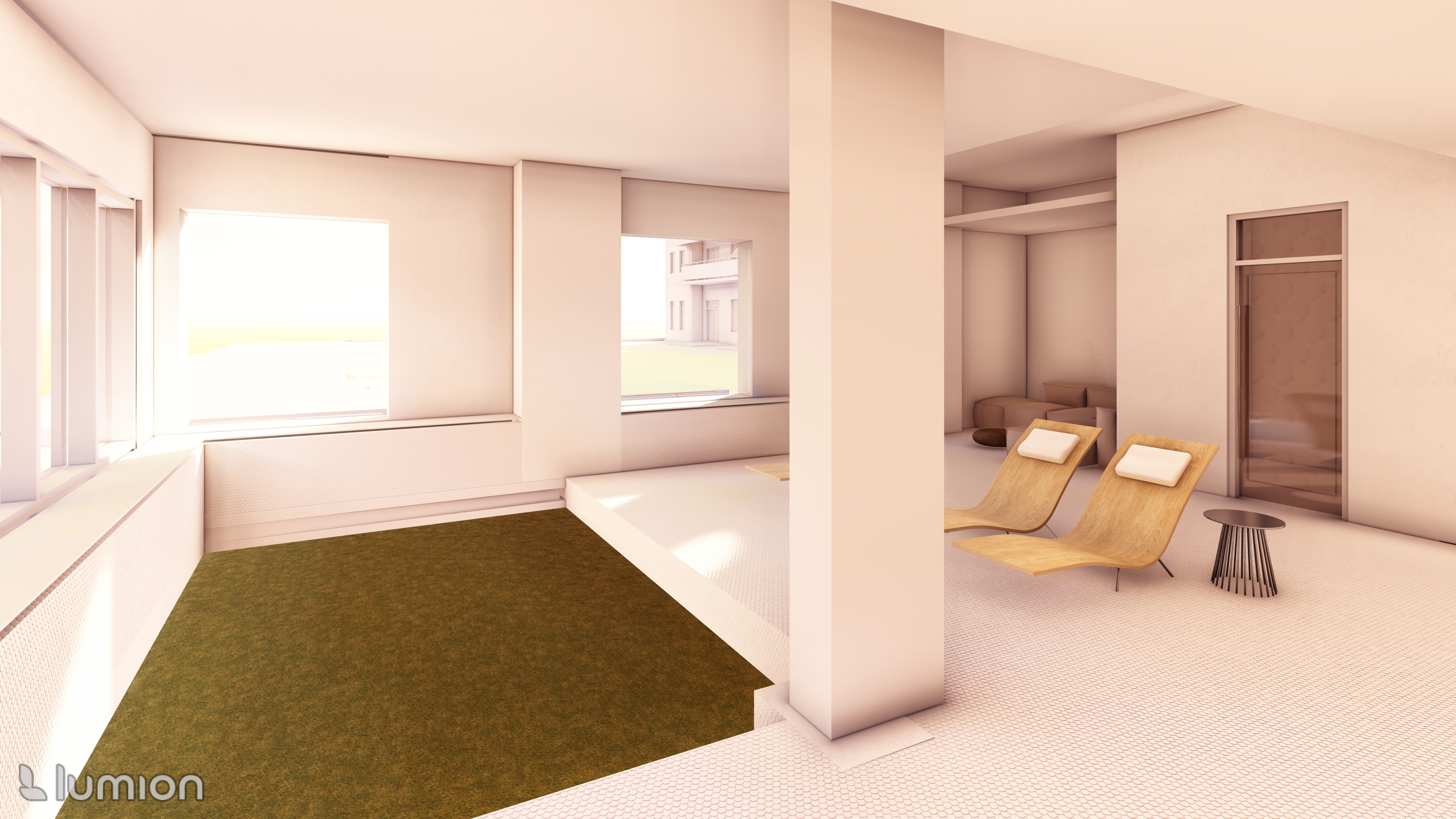 base image fixed reference do not move walls windows structural elements or existing furniture layout enhance only do not reinvent goal ultra realistic architectural rendering indoor pool area 5 star wellness resort feel warm luminous emotional lively materials apply exactly floor polished calacatta statuario penny round mosaic warm caramel veining wet reflections near pool wall below windows full length same penny round mosaic as floor c05 polished white marble look porcelain warm beige caramel veining continuous from floor up to window sill height pool border coping honed concrete look porcelain warm medium gray walls warm creamy off white soft and luminous not stark furniture upgrade in place teak or woven rope loungers thick cushions in terracotta sage dusty coral brushed brass side tables with stone tops resort quality curated not generic plants large bird of paradise fiddle leaf fig or monstera in architectural matte concrete or ceramic planters pool corners window edges along walls lush and full primary color accent against neutral palette courtyard view all windows cour int rieure garden mature trees hedges stone pathways small fountain warm golden afternoon light pouring in hdr balanced bright but fully detailed not blown out pool water clear blue green realistic caustic light shimmer on floor and walls slight surface ripple lighting dominant source warm natural daylight from courtyard windows 3000k artificial fill recessed ceiling downlights indirect amber cove lighting rich contrast soft shadows no flat lighting people 6 total ages 45 70 max 3 with grey white hair all look healthy active happy varied ethnicities 1 2 in the pool 2 on loungers 1 2 walking or standing poolside candid mid movement no one looking at camera natural and genuine not posed render ultra realistic high resolution global illumination ray traced reflections and caustics real skin tones depth of field warm cinematic grade negative not a care home not a public pool no cool lighting no flat lighting no moved walls or layout changes no posed people no grey or generic furniture not a photograph a high end architectural rendering