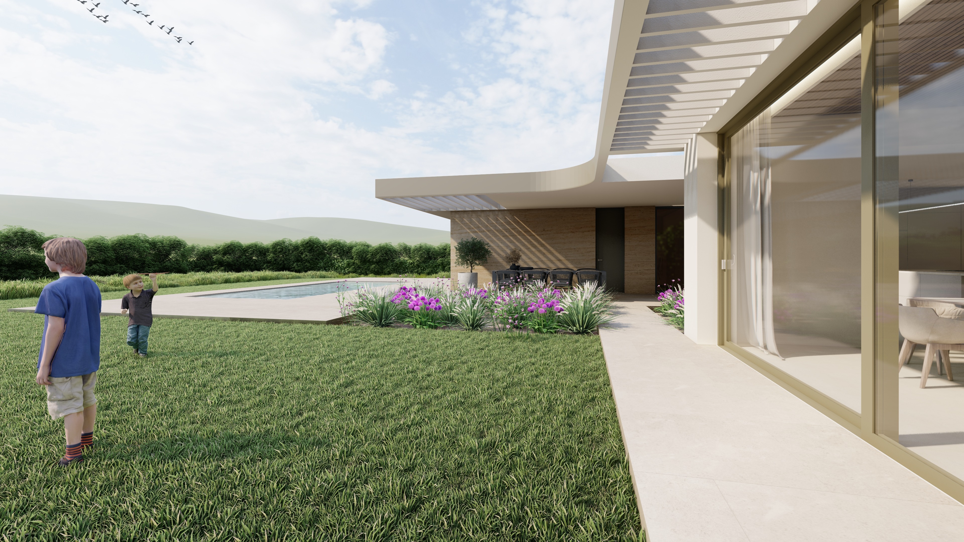 add mixed forests to the hills on the distant horizon preserve all the architecture change nothing except the horizon and keep the sunset atmosphere