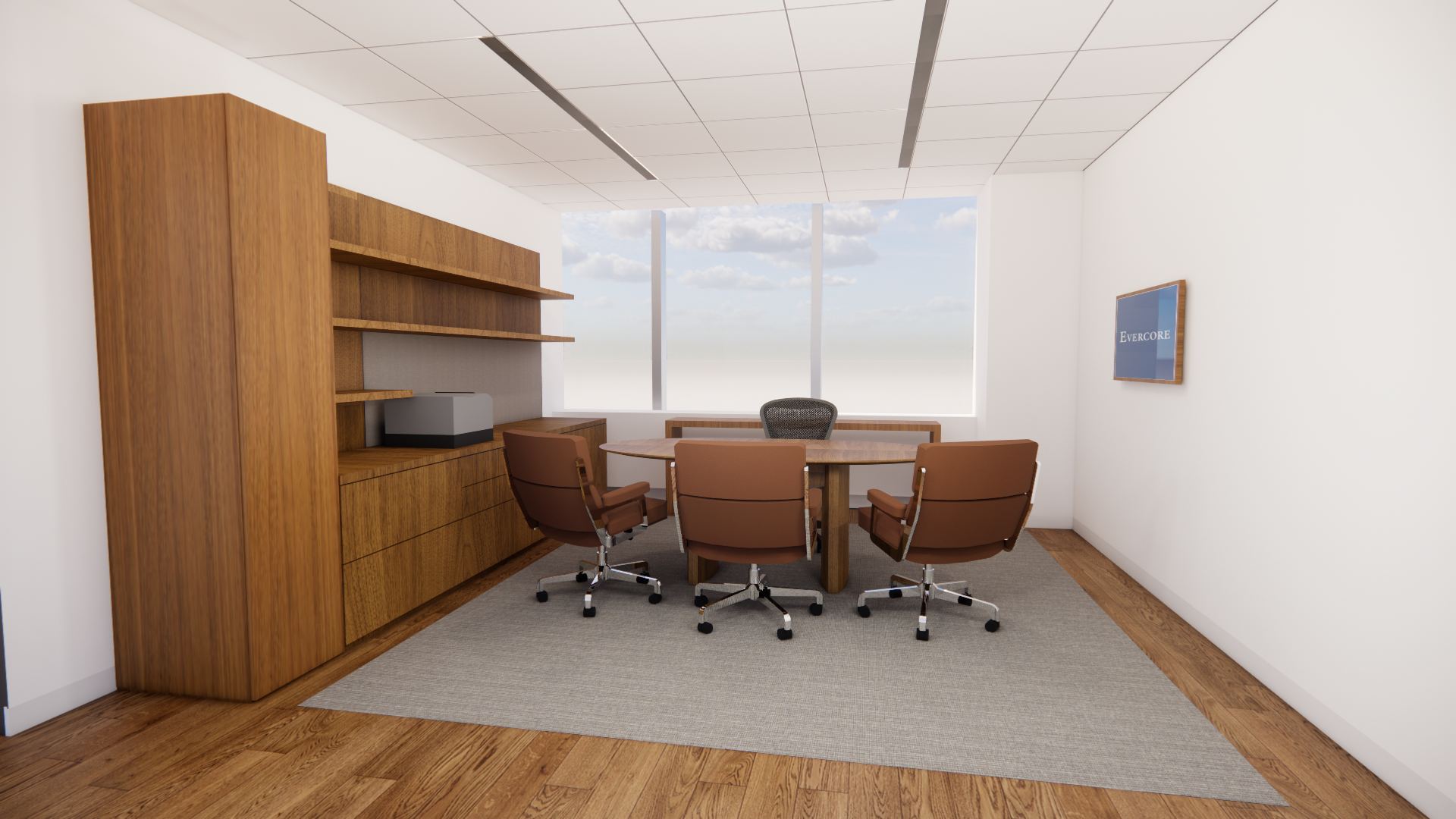 create a photorealistic rendering add midtown new york views from the 43rd floor keep all the elements proportions and finishes as they are add books and a plant on the shelves turn on the two linear light fixtures in the ceiling make wood frame on right wall 2 wide