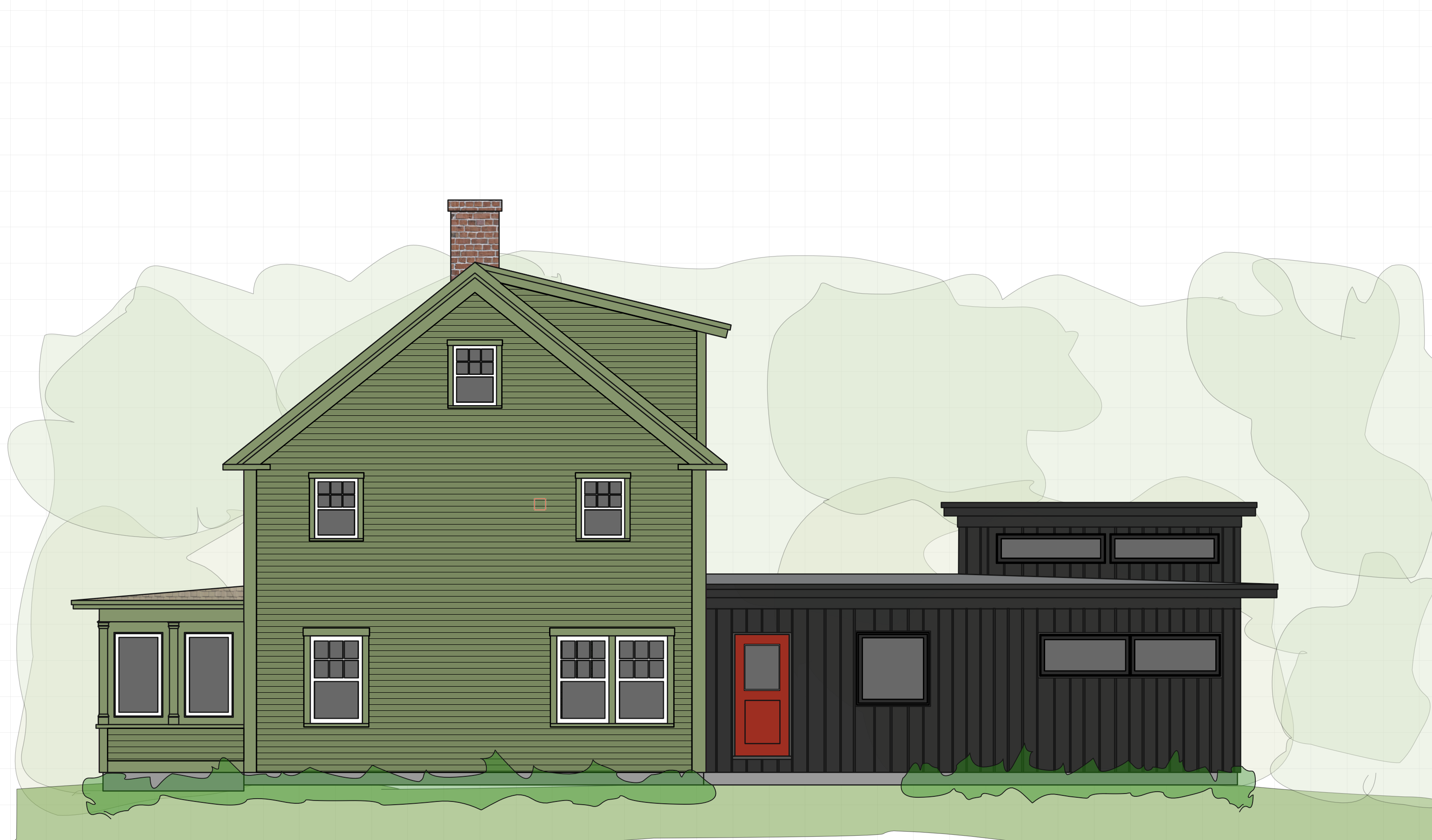 do not change colors do not change geometry add lawns in front and trees behind