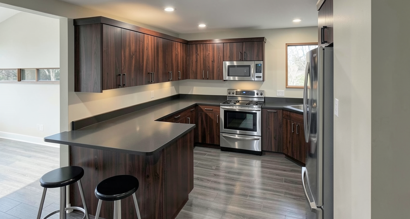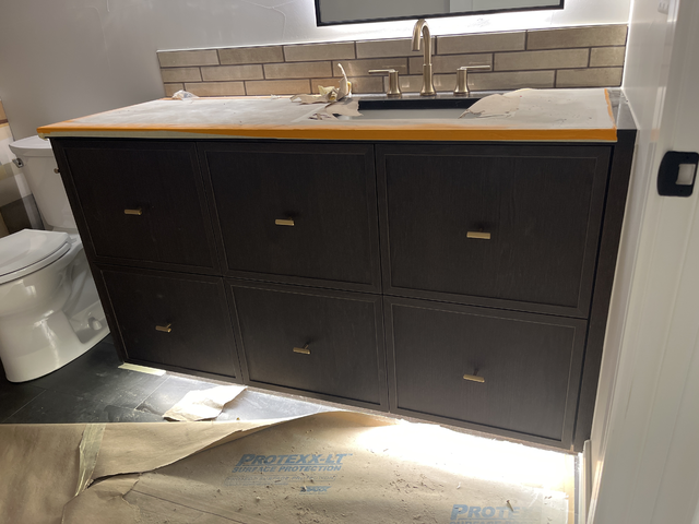 do not change the cabinets in any way preserve the exact cabinet colors materials finishes dimensions door and drawer styles hardware spacing alignment and all geometry exactly as shown do not alter the countertop shape backsplash appliances flooring lighting fixtures or wall structure only remove the construction materials clutter and mess from the scene clean the room and make it look finished and staged add a few simple tasteful home accessories appropriate for the style of the space but do not add or remove any furniture windows or architectural elements maintain the original lighting direction and realism enhance clarity and polish the photo while keeping the cabinetry and room design completely unchanged do not alter the lighting to keep the cabinet colors as they are in the image add mirrors between the add tile flooring stage as a modern luxurious powder bath