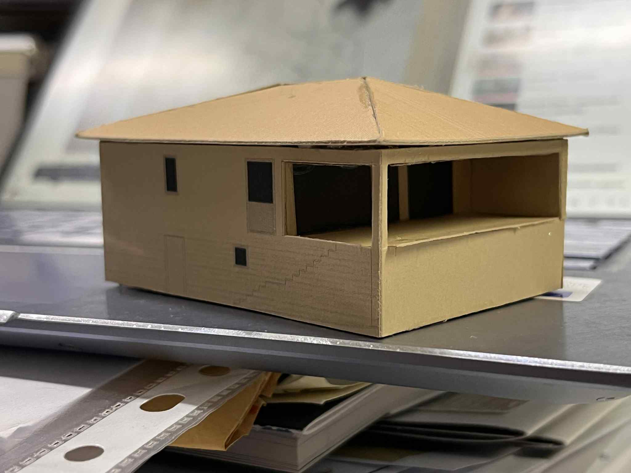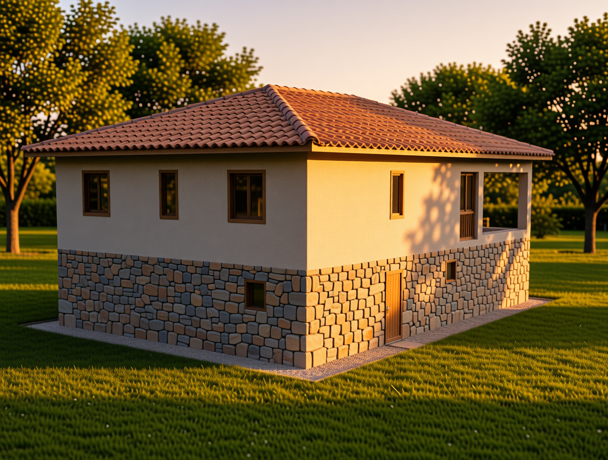 vivienda de dos plantas la planta baja est revestida con mamposter a ordinaria de peque o tama o la planta primera tiene un revestimiento de mortero de cal teniendo unos huecos acristalados de gran formato entre la casa y el porche la cubierta es de teja est situada en una zona con cesped y rboles siendo la hora del d a ltima hora del d a
