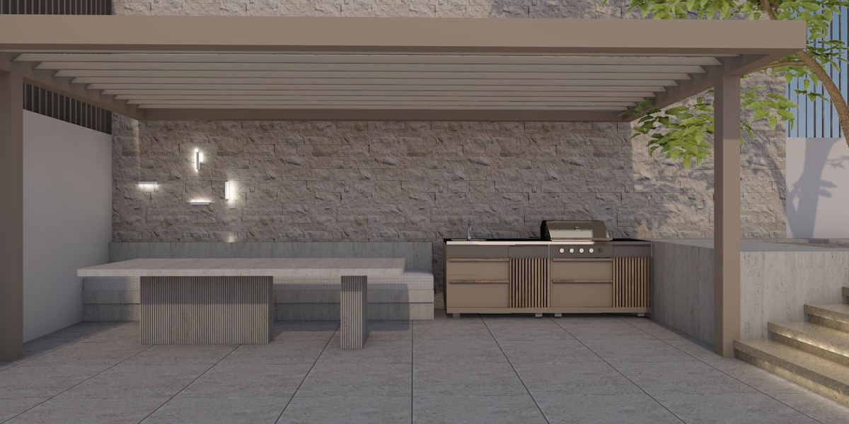 as a continuation of the exterior fa ade this area features an outdoor living and dining space with a travertine dining table as the central element a pergola in a beige sand tone is positioned above providing shade while maintaining the light neutral aesthetic of the composition behind the main view a built in sofa is integrated into the structure finished with off white waterproof cushions arranged in a clean and elegant manner on the right side there is a built in bbq in a beige finish detailed with linear wooden handles as shown in the reference stone on the wall behind the bbq and sofa on this wall there are 4 white linear sconces on the left side which are lighting the railing above the walls are also beige sand tone