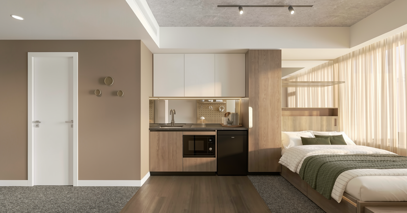 change only the following elements bathroom door finish skirting along the pod update both so they are exactly the same colour and finish as the adjacent wall matching tone texture and paint finish seamlessly do not change anything else in the image maintain all existing geometry materials lighting shadows reflections furniture fixtures and overall composition exactly as they are ensure the result looks natural and consistent with the current lighting conditions with no visible colour mismatch or editing artifacts photorealistic finish seamless integration