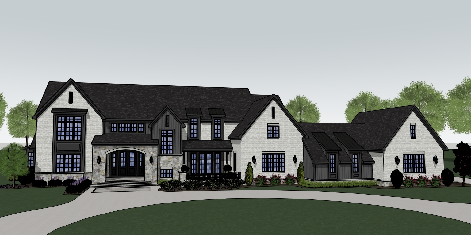 partly cloudy sky deciduous trees in background charcoal trim black windows off white brick fond du lac stone