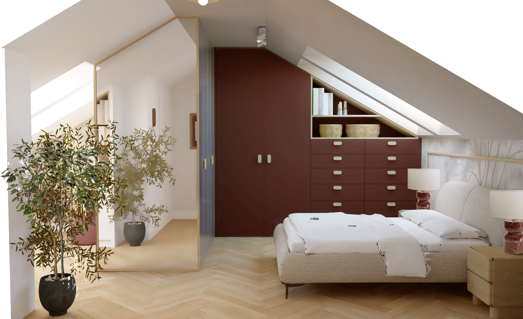 adjust the bedding on the bed and add dark burgundy decorative pillows