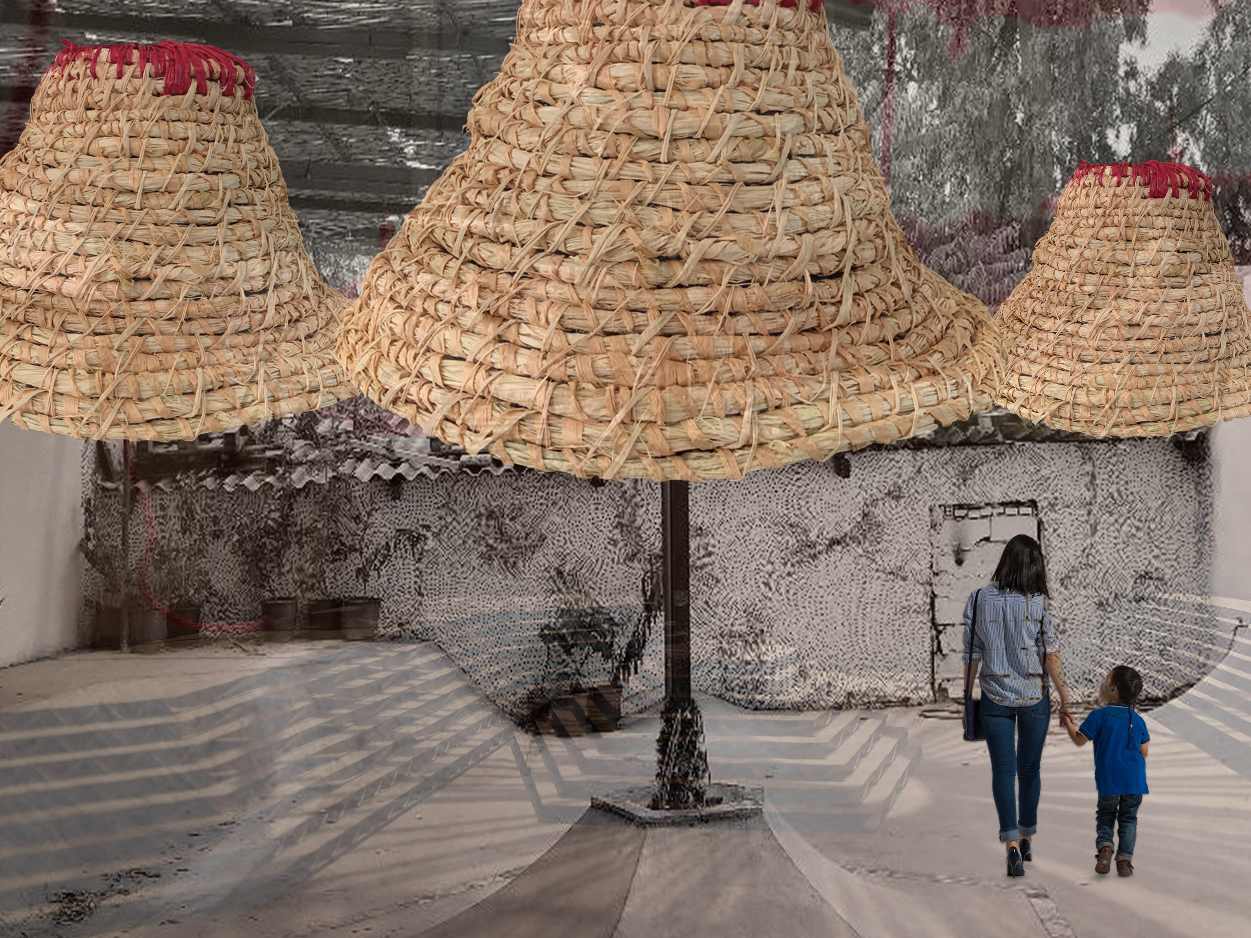 render a vibrant scene of traditional architecture with cone shaped thatched roofs in warm beige and reddish brown tones add lush green trees for natural contrast include lively colorful clothing purple blue and orange on people embodying a sense of community and culture the atmosphere should be serene bright and inviting capturing the essence of everyday life in a harmonious setting