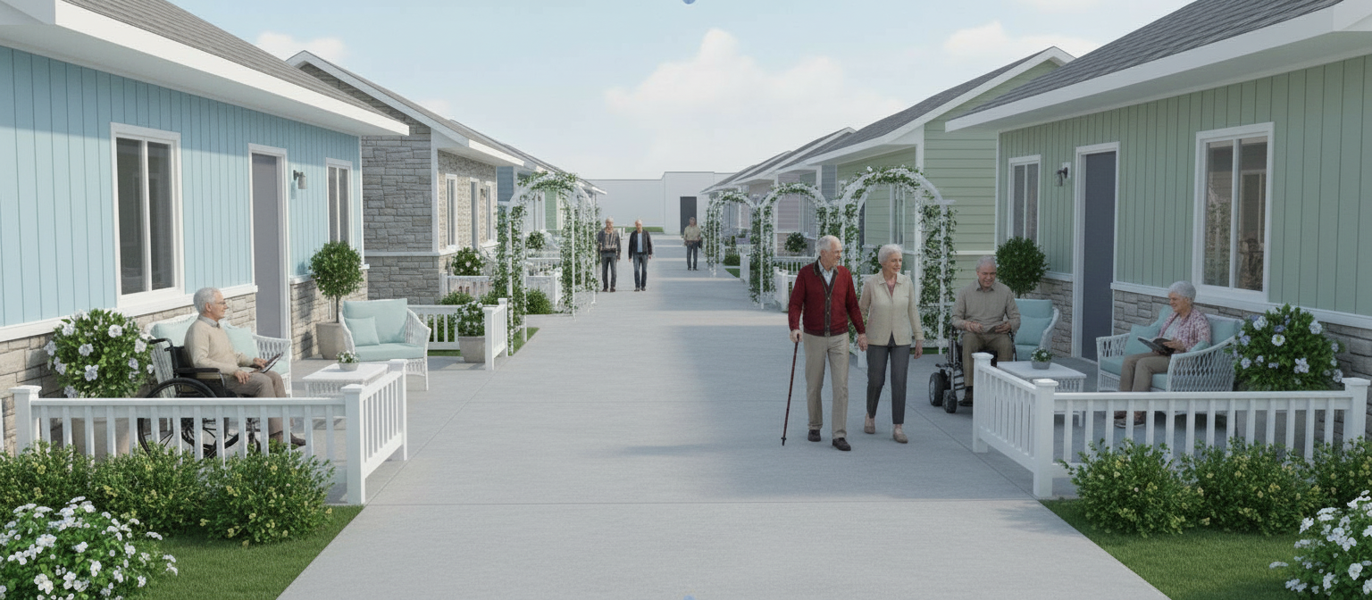 make each home connect to the one beside it add elderly couples walking on the walkway add elderly people sitting on the patios add elderly people in wheelchairs and using canes add a couple care giver staff members