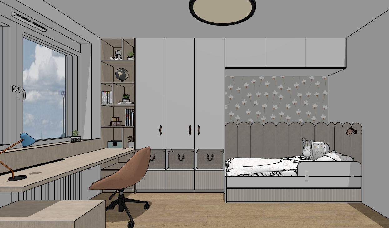 render a cozy and modern bedroom interior with a scandinavian design the walls are a soft light gray providing a calm and soothing atmosphere the bed with its scalloped headboard features light beige fabric for a cozy and inviting feel complemented by white bedding with subtle elegant patterns the wall behind the bed has a wallpaper with delicate white floral designs on a muted gray background adding a touch of whimsy to the space the wardrobe and shelves have a light oak wood finish offering a natural and warm touch the desk is also made of light wood positioned by a large window showing a bright blue sky with fluffy clouds casting natural light into the room a modern blue desk lamp adds a pop of color while the chair has a sleek ergonomic design in a warm brown tone the flooring is light oak wood enhancing the room s warmth and cohesion the overall atmosphere is serene welcoming and perfectly balanced between functionality and style