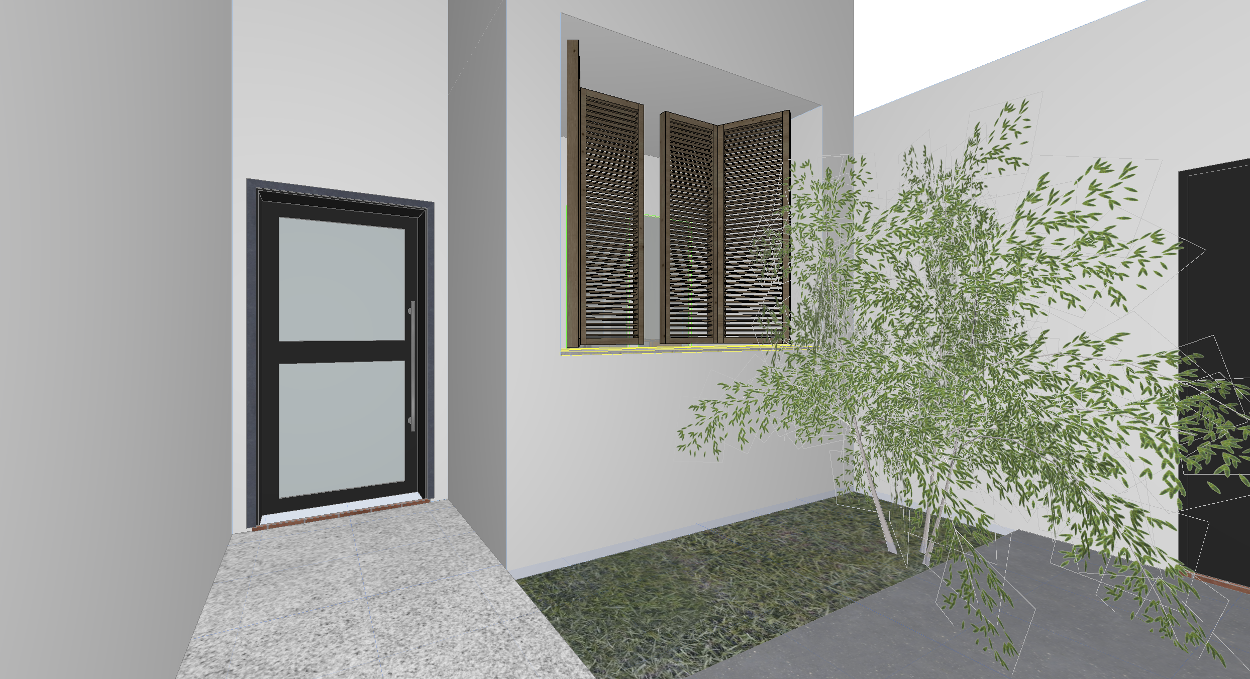 a serene courtyard scene featuring minimalist architecture a modern building with light grey walls and a matte black door the window has wooden shutters in a rich oak color lush green foliage from a slender tree lines the area beside a dark modern stone path the ground is a soft mix of mossy greens hinting at freshly cut grass the atmosphere exudes tranquility and calmness under a clear blue sky