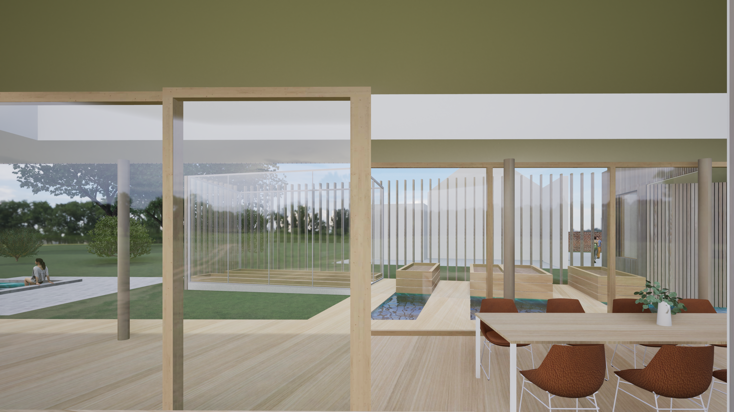 work as if you were a professional in creating 3d renderings for architectural projects without changing anything in the elements present in the original image make the visual of the new construction more realistic finally adjust the grain and lighting of the image to make it more cinematic add grass on the lawn areas leave the wood siding rendering as is keep the sky with some clouds in the picture you can see raised beds and a greenhouse which should be full of plants and leaves