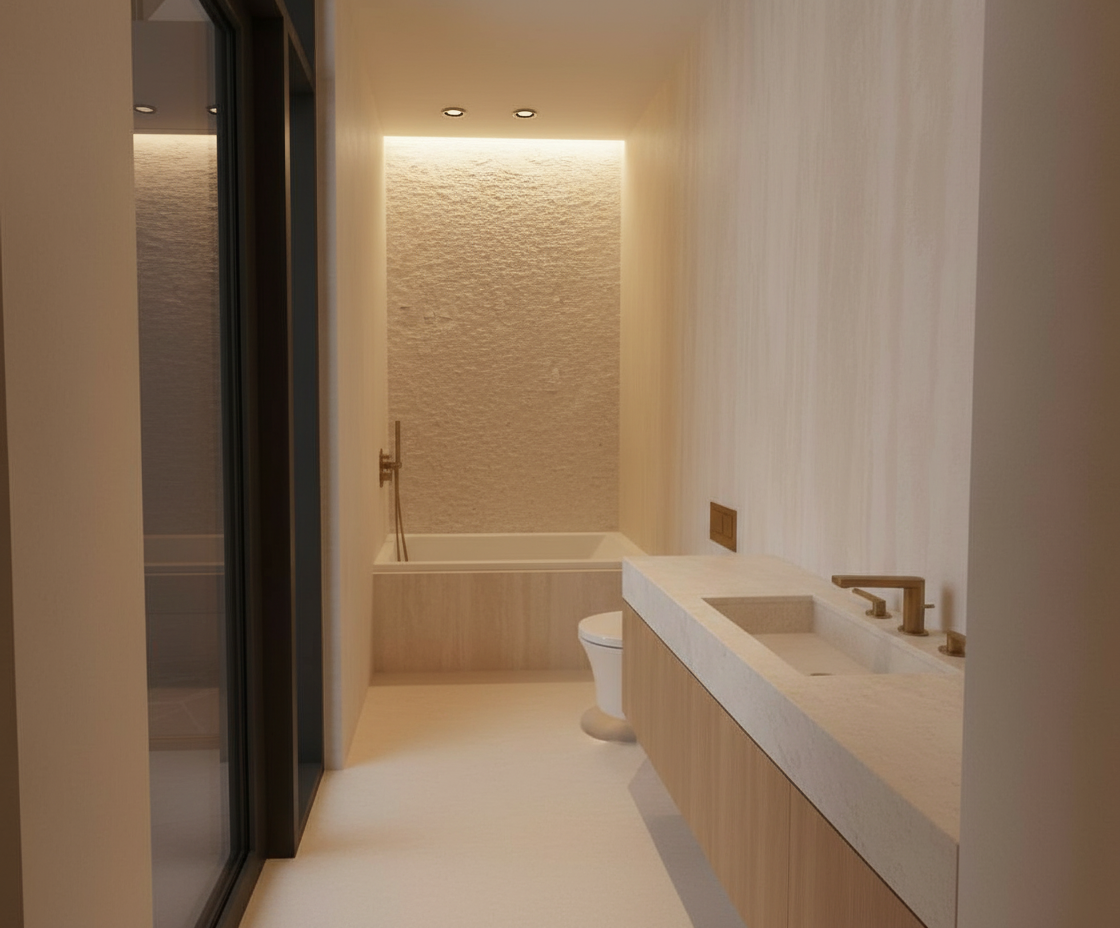 create a serene and minimalist modern bathroom with soft ambient lighting the walls are a soothing off white with a subtle texture the bathtub and sink are crafted from smooth white stone the vanity cabinet is light wood with a natural finish the faucets and fixtures are elegant matte gold the floor is sleek off white gentle warm recessed ceiling lights enhance the calm atmosphere the overall ambiance is peaceful and luxurious evoking a spa like retreat