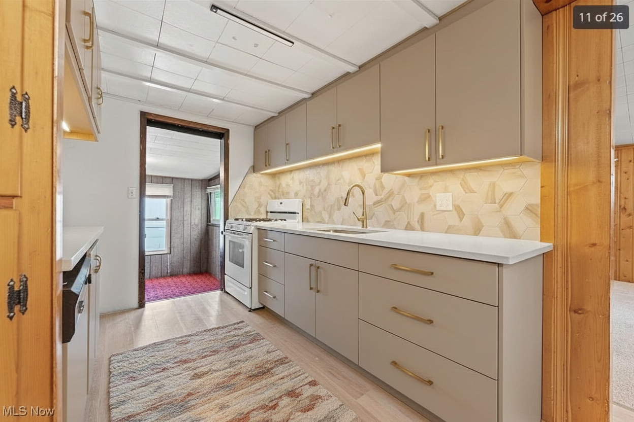 give this kitchen a modern update recreate dark magenta colored cabinets with modern hardware and a backsplash that is modern but has a fun pattern give the image an overall warm atmosphere add items like a coffee maker and toaster to the counter to make the space appear homey add a typical door to hide the space in the back of the image