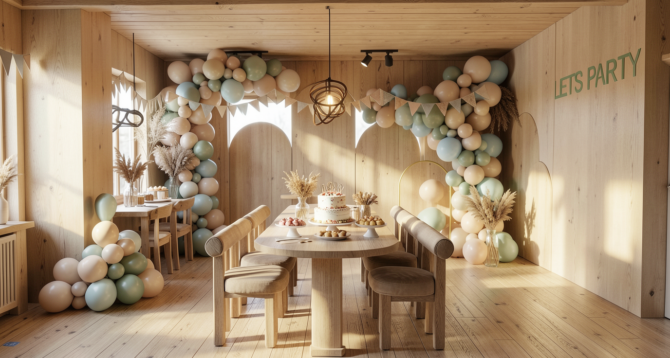 ultra realistic interior birthday party setup modern elegant event hall interior luxury balloon decoration in pastel tones white blush pink champagne gold large personalized birthday backdrop with soft fabric texture stylish dessert table with detailed cake and sweets natural flower arrangements warm ambient lighting cinematic soft light realistic shadows volumetric light rays glossy floor reflections high ceiling modern chandeliers premium materials marble velvet glass depth of field 8k resolution photorealistic architectural visualization ultra detailed textures professional event photography style sharp focus global illumination ray tracing