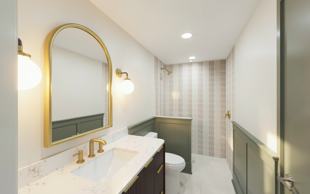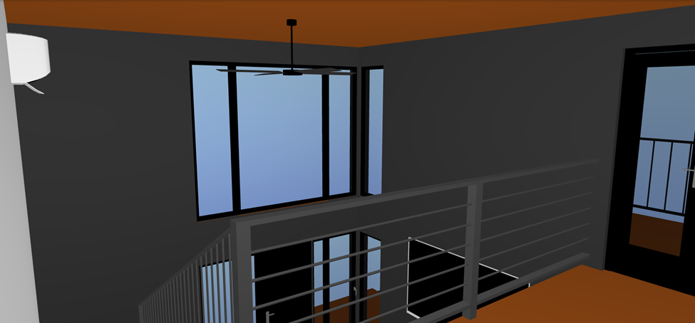 this is the main living space in a small modern home shot from the loft area on the second floor towards the front door the ceiling and floor should be in a walnut plank with the walnut planks going front to back outdoors show the forest of the pacific northwest lighting should be golden hour