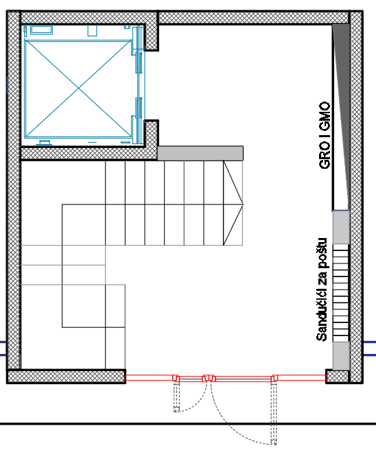 create a beautifully rendered architectural blueprint of a stairwell use a soothing palette with light blues for the structural elements and outlines and soft grays for the textures the floor plan should have hints of white to emphasize cleanliness and modernity utilize soft red for indicating specific areas creating a gentle contrast the atmosphere should feel calm and organized enhancing clarity while maintaining a professional and sleek design stryctly folow layout