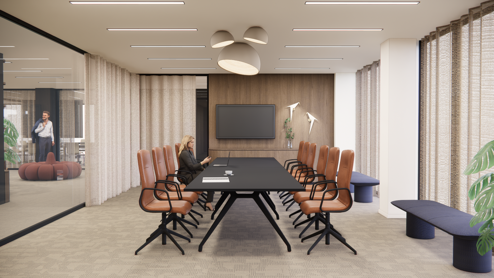 render a modern office conference room with an elegant and professional atmosphere the room features a large sleek black conference table surrounded by ten luxurious leather chairs in a rich caramel brown the walls are adorned with light wood panels and a large dark flat screen tv a minimalist ceiling light fixture casts a soft warm glow adding to the room s sophisticated ambiance neutral toned patterned carpet covers the floor complementing the cream colored walls and sheer beige curtains large glass windows provide natural light enhancing the lush green indoor plant accents include subtle blue benches along the window side maintaining a balanced and tranquil environment