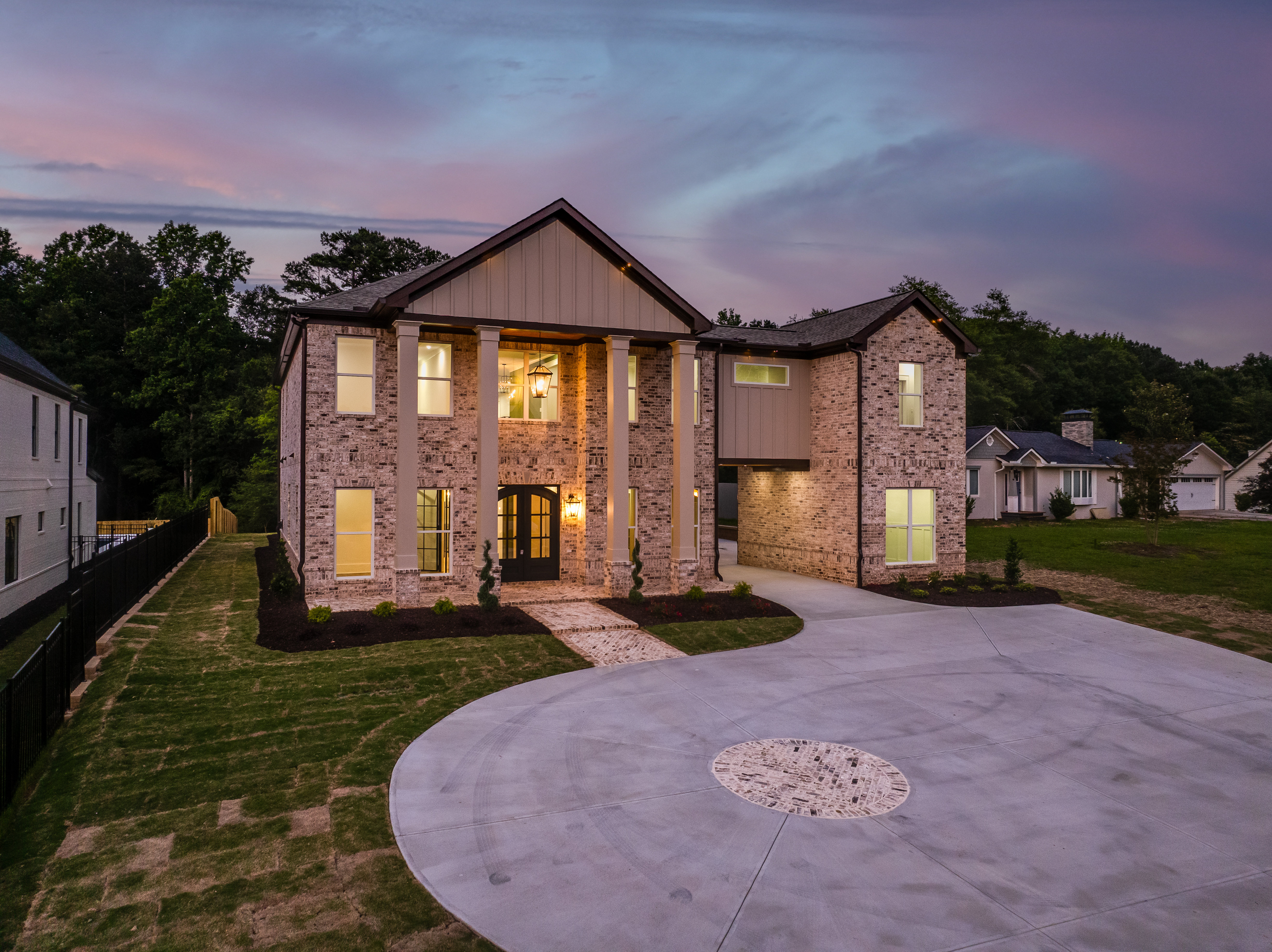exterior shot paint exterior creme dark trim circle driveway out front architecture