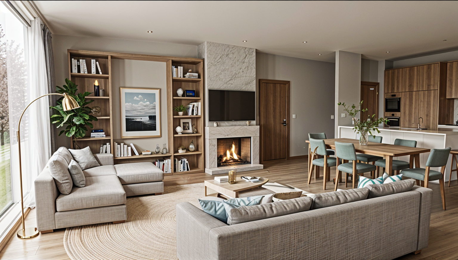 maintain the existing house exactly as shown do not modify rooflines stone brick windows proportions garage location or structural massing add a wraparound deck that begins at the side of the house where the ground currently slopes and continues around to connect seamlessly with the existing rear deck the deck should extend over the garage and concrete driveway below with realistic structural support beams integrated beneath it the deck must feel architecturally intentional not an afterthought use substantial horizontal framing and concealed structural supports where possible under deck structure should align logically with garage wall below deck material white oak tone wood raw natural finish neutral and soft no orange undertones matte finish clean modern lines