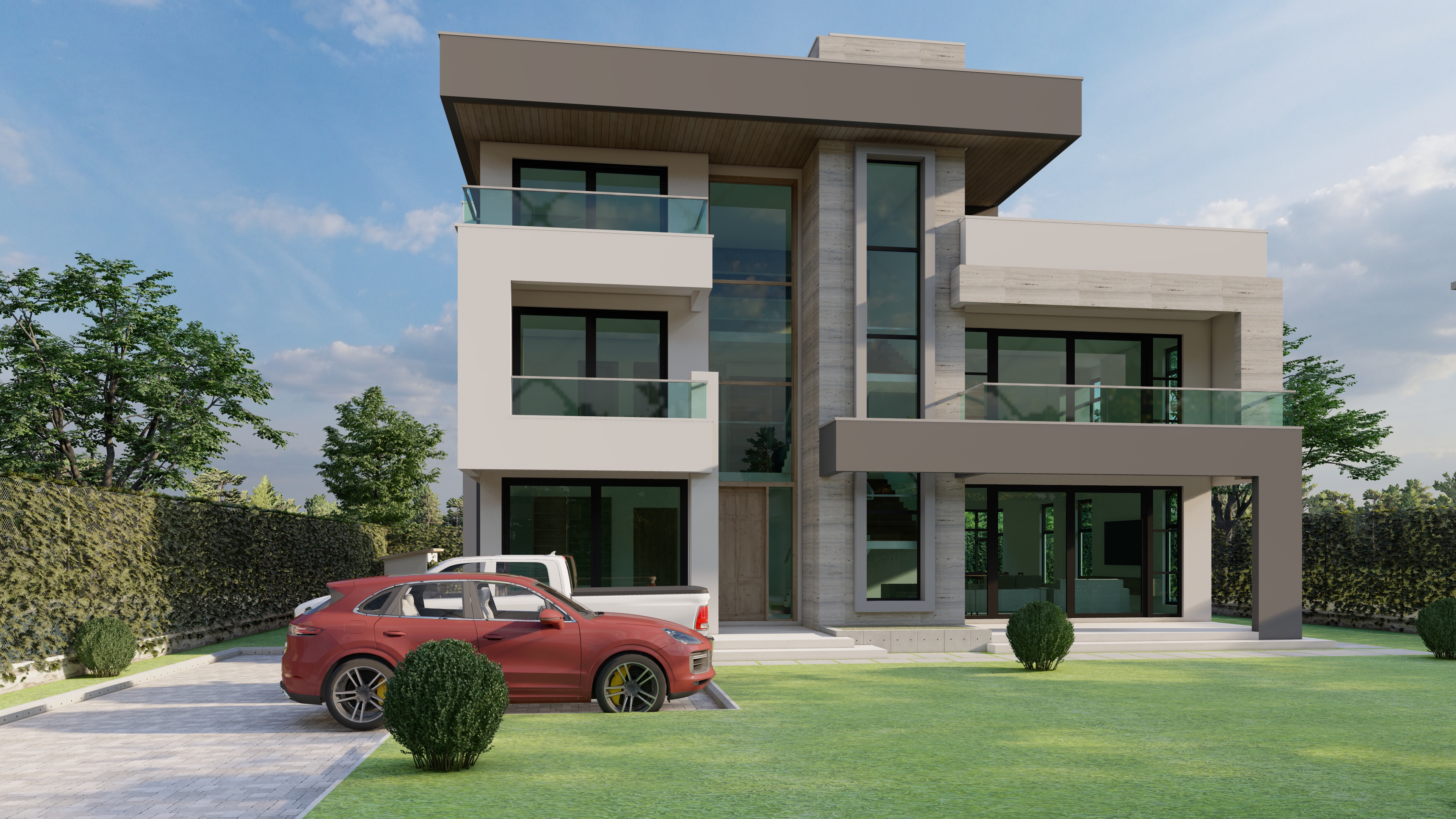 modern three story house with large glass windows gray and beige facade lush green lawn and neatly trimmed bushes surround the house red car parked on light gray stone driveway clear blue sky with soft white clouds trees with vibrant green leaves in the background atmosphere is serene and sunny reflecting warmth and tranquility