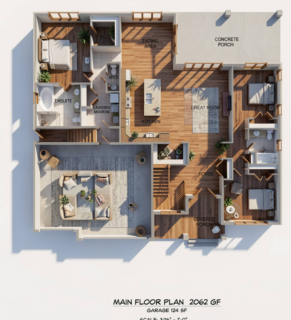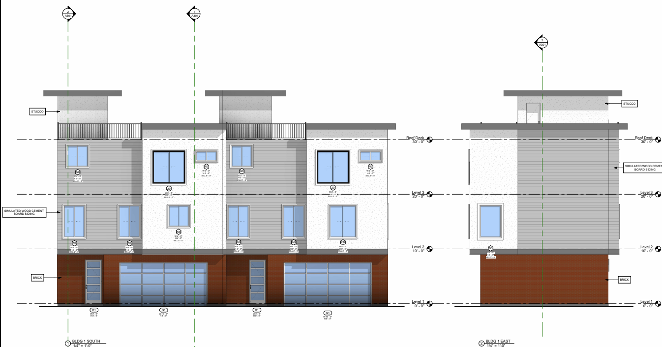 make the brick a dark brown purple color almost black make the stucco a cream color make the siding a dark charcoal color have the image with morning time light and the angle of the image looking at the corner of the buiding so you can see the side and front elevation