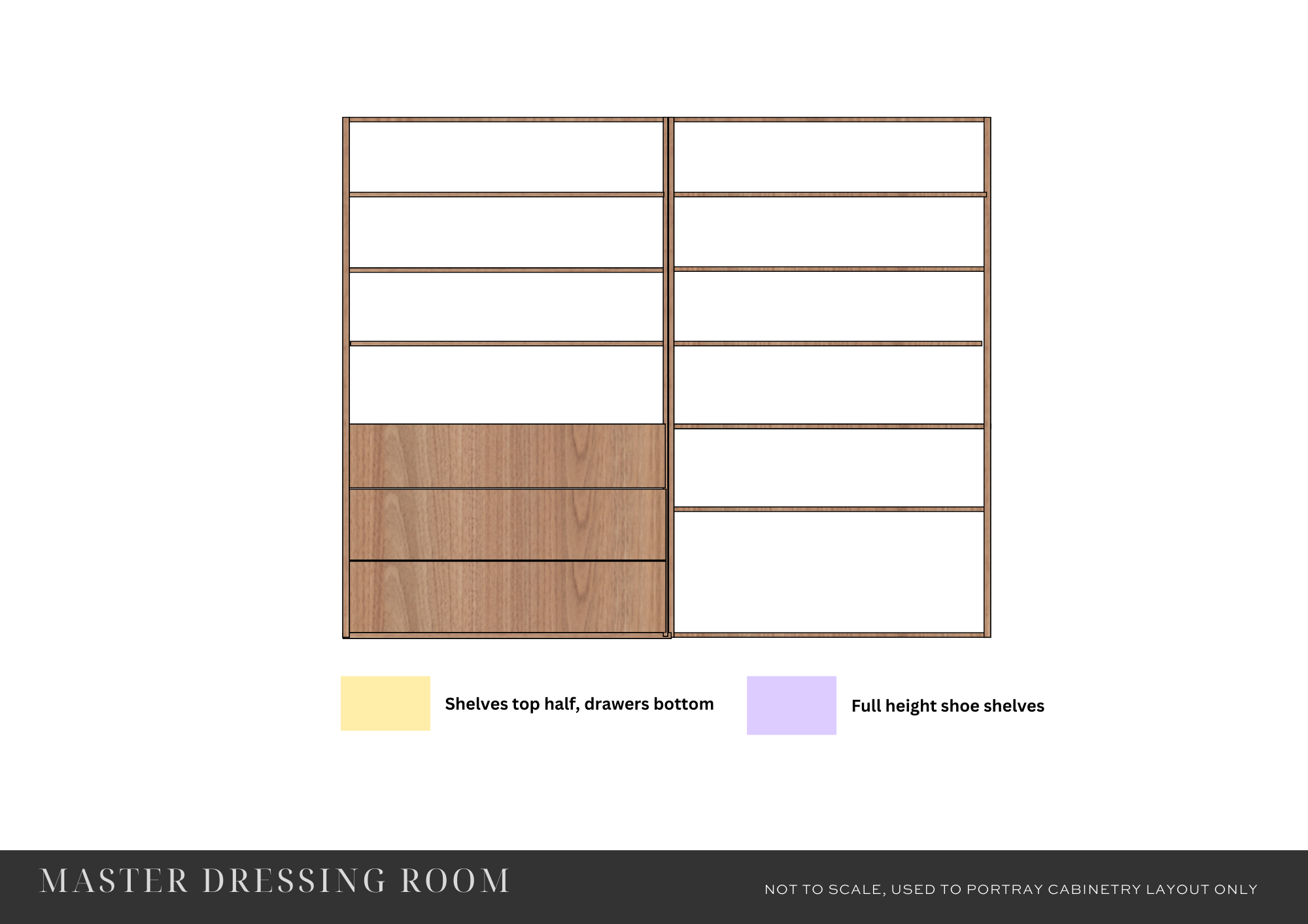 here is a strong geometry locked prompt you can paste into archsynth veras midjourney lookx to convert this master dressing room joinery elevation into a 3d render while keeping the layout exactly the same 2d joinery elevation 3d dressing room render prompt use the provided wardrobe elevation drawing as exact joinery construction geometry and convert it into a realistic 3d interior perspective of a master dressing room wardrobe the shelving layout drawer positions vertical partitions and overall proportions must remain identical to the drawing do not redesign reinterpret move resize or modify the joinery configuration interpret the elevation drawing as construction geometry and extrude it into 3d depth without altering layout or proportions joinery design built in master dressing room wardrobe joinery cabinet material natural warm timber veneer similar to walnut or oak matte finish soft natural wood grain modern flat panel drawer fronts slim joinery edges joinery layout left section upper open shelving lower drawers exactly as shown in elevation right section full height shoe shelving evenly spaced open shelves maintain the exact spacing and shelf positions from the drawing styling minimal wardrobe decoration add light wardrobe styling only include neatly folded clothes stacks handbags or clutch bags decorative storage boxes luxury shoe display on the right shelves a few books or accessories styling should look clean and curated like a luxury walk in wardrobe do not overcrowd shelves room environment place the wardrobe inside a minimal master dressing room interior walls smooth white plaster walls floor light neutral carpet or soft oak timber flooring keep the environment minimal so the joinery is the focus lighting soft built in wardrobe lighting subtle led shelf lighting soft ambient room lighting camera architectural interior camera eye level view slight perspective 24 28mm architectural lens shows depth of shelves and drawers render style clean modern architectural visualization minimal styling focus on joinery and wardrobe functionality render quality ultra photorealistic high resolution realistic timber grain texture soft shadows architectural visualization quality critical instruction use the elevation strictly as joinery construction geometry and extrude it into 3d without altering layout or proportions