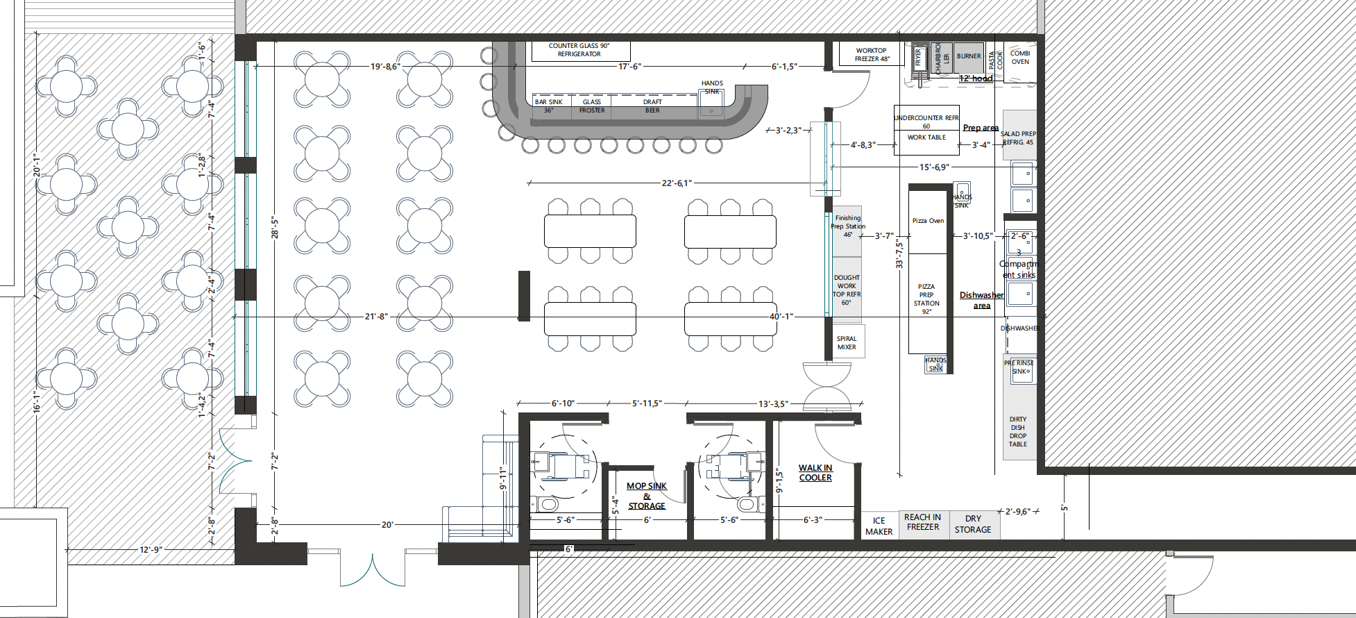 modern brazilian italian casual restaurant interior based on the provided floor plan the design should feel young warm inviting and elevated almost upscale but still approachable and comfortable for families and groups of friends create a strong visual identity combining modern italian design with subtle brazilian elements the bar must be a central feature with brazilian hydraulic tiles but use different patterns for the bar front and the surrounding floor area do not match them exactly the tiles should feel curated colorful and authentic but balanced with neutral tones around the space design a beautiful and prominent expo station kitchen pass that connects the dining room to the kitchen inspired by modern open kitchens with warm wood shelving plates soft lighting and a crafted design forward look not industrial it should feel like a focal storytelling element include a glass enclosed pizza station facing the dining room like a clean aquarium style kitchen window where guests can clearly see pizzaiolos working the glass should feel minimal elegant and intentional creating interaction without noise or mess the ceiling design is very important create a lowered ceiling with architectural elements such as wood slats beams or framing details integrate warm pendant lights and soft indirect lighting to create a cozy intimate atmosphere especially at night the ceiling should feel designed not flat or generic use natural materials like warm wood soft fabrics and subtle textures keep the palette modern and balanced warm neutrals with accents of color coming from the tiles and details seating should be a mix of small tables and communal tables for groups with a layout that feels lively but comfortable lighting should be warm intimate and layered no harsh lighting avoid fine dining stiffness avoid overly luxurious or formal design the space should feel stylish vibrant welcoming and full of personality reflecting a young and growing brand