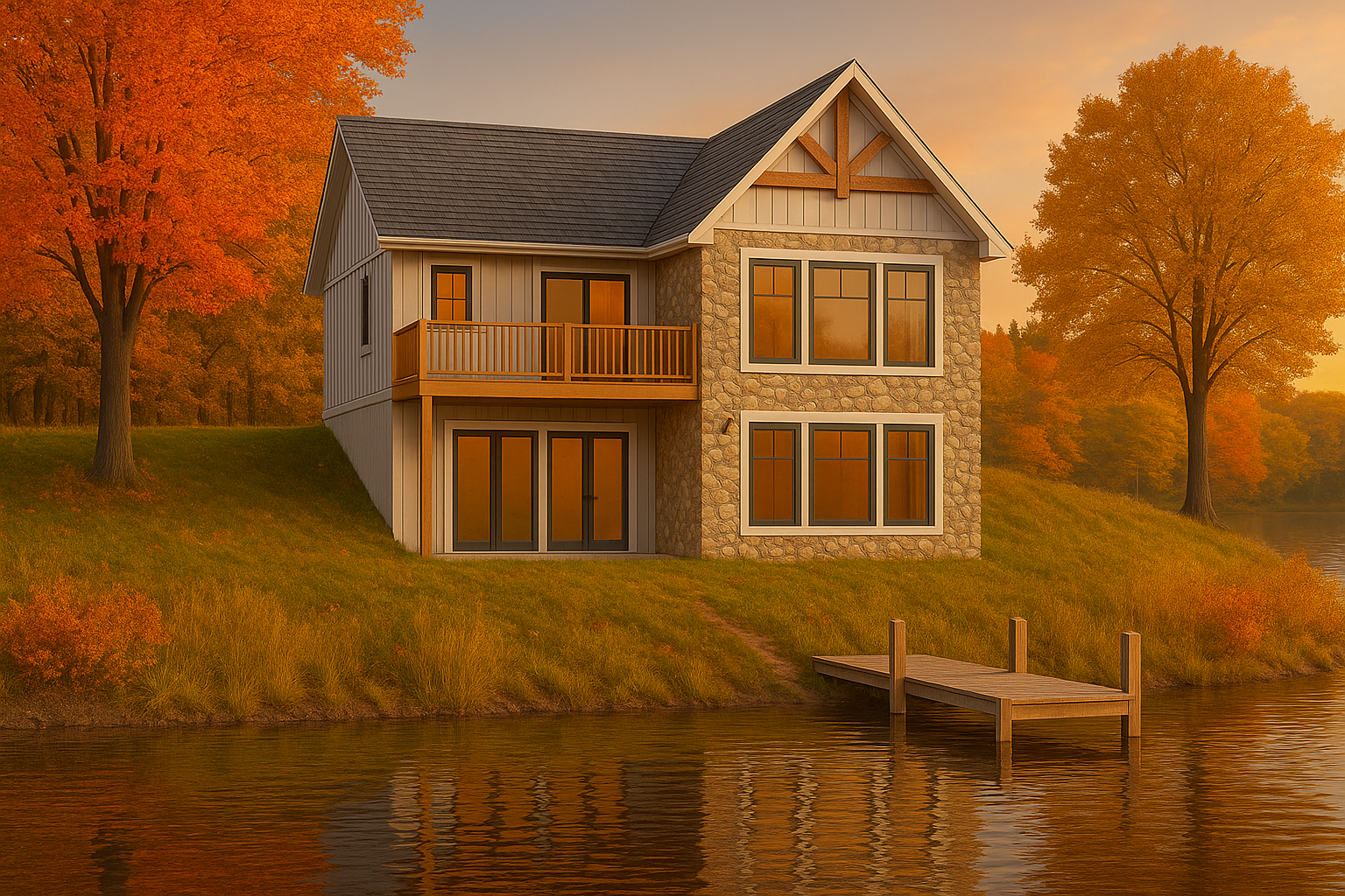 je veux voir cette maison des revetement sobre situe sur le bour d un lac dans un environnement forestier