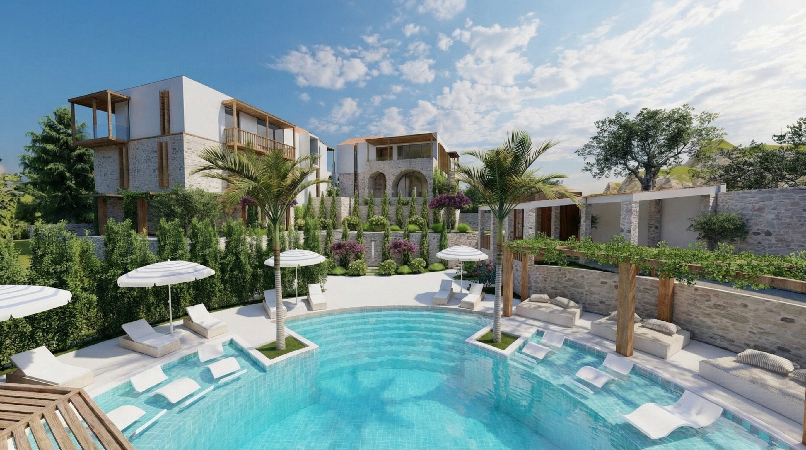 convert this architectural render into a precise 3d model visualization preserve the exact geometry spacing and stepped topography keep all buildings terraces pools and paths in their original positions and proportions remove all colors textures glass reflections shadows and environment apply a single neutral clay or light gray material to all surfaces pools should be simple flat shapes without water reflections sharp edges accurate forms no artistic interpretation soft studio lighting white or light gray background focus on architectural structure massing and spatial clarity