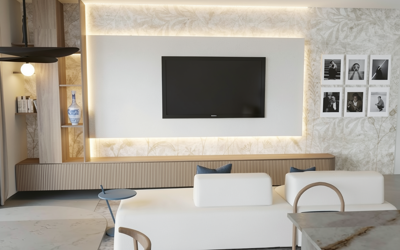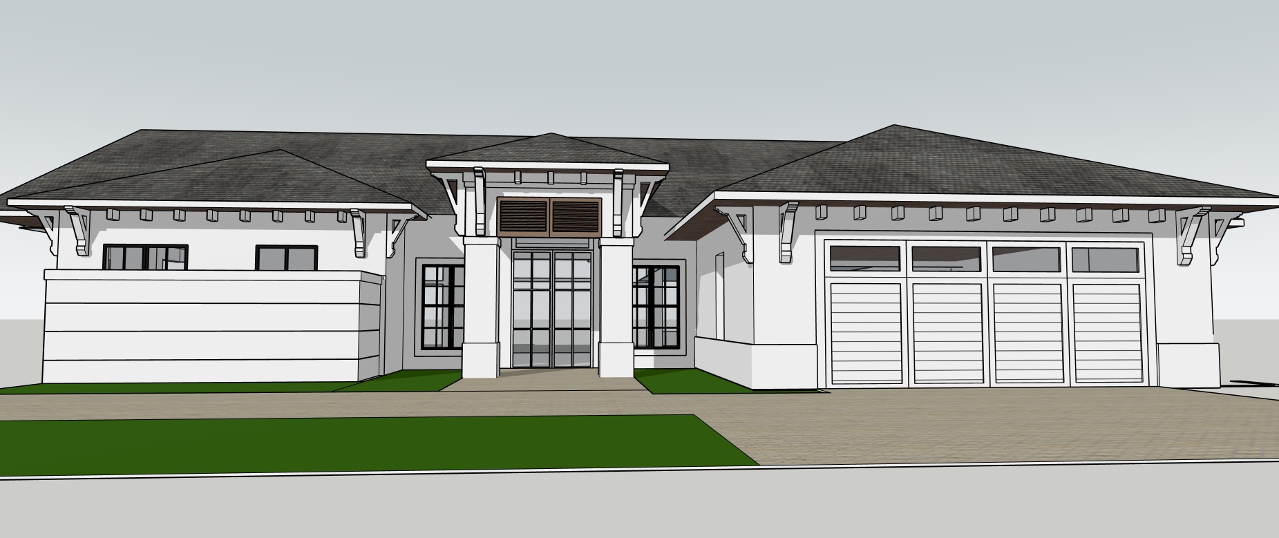 create a hyper realistic exterior photograph of a coastal house front exterior during a vibrant sunny day the house has a sleek tropical modern design with crisp white walls and white wood brackets the roof has gray cement tile large glass windows reflect the clear blue sky the garage door is white wood with some small glass openings palm trees with their lush green fronds add a tropical touch the house has surrounding green lawn the atmosphere is tranquil and luxurious with sunlight casting gentle shadows evoking a sense of relaxation and opulence