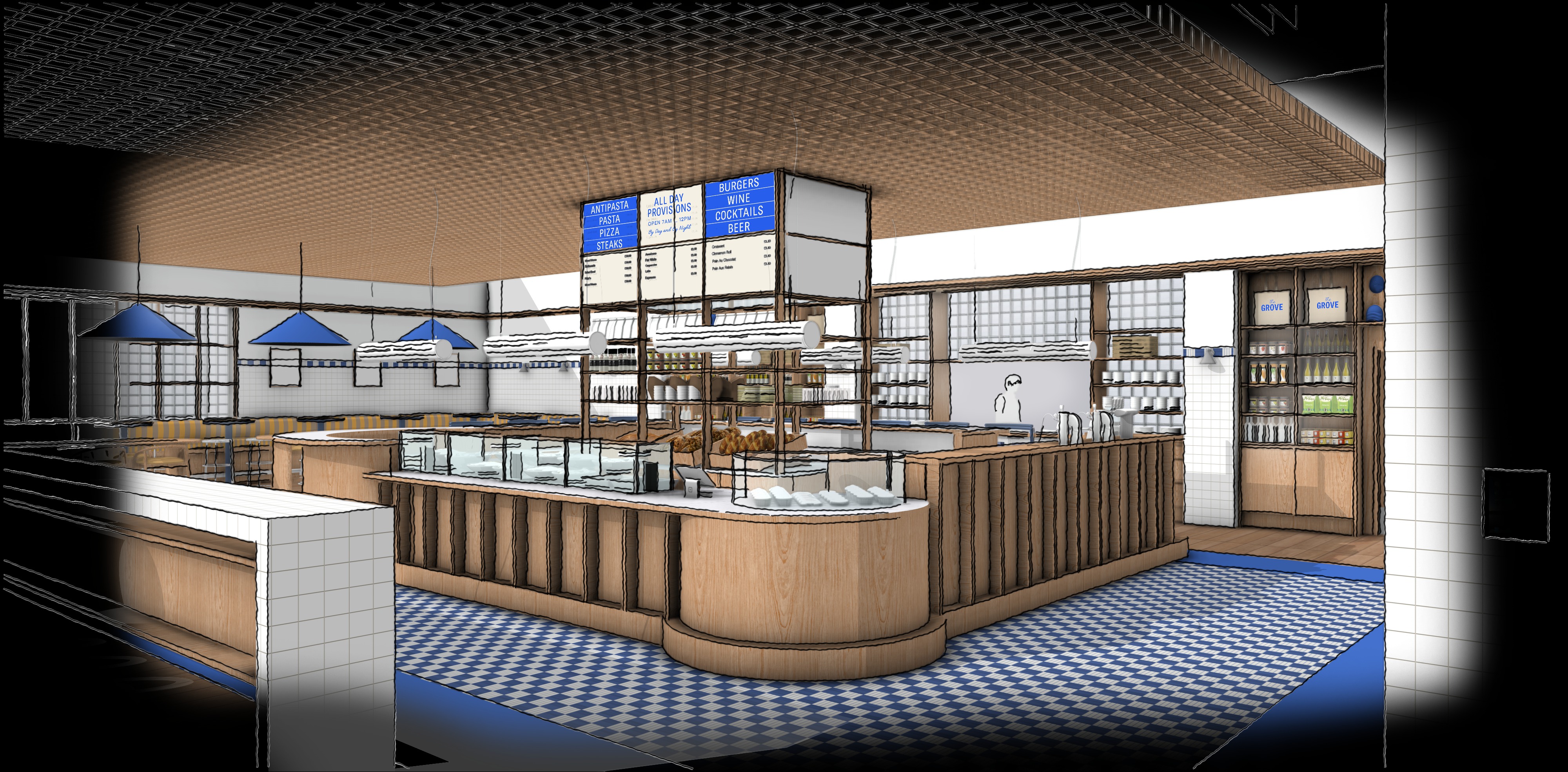 make this sketch a editorial style photorealistic render in the style of architectural digest day time setting add people
