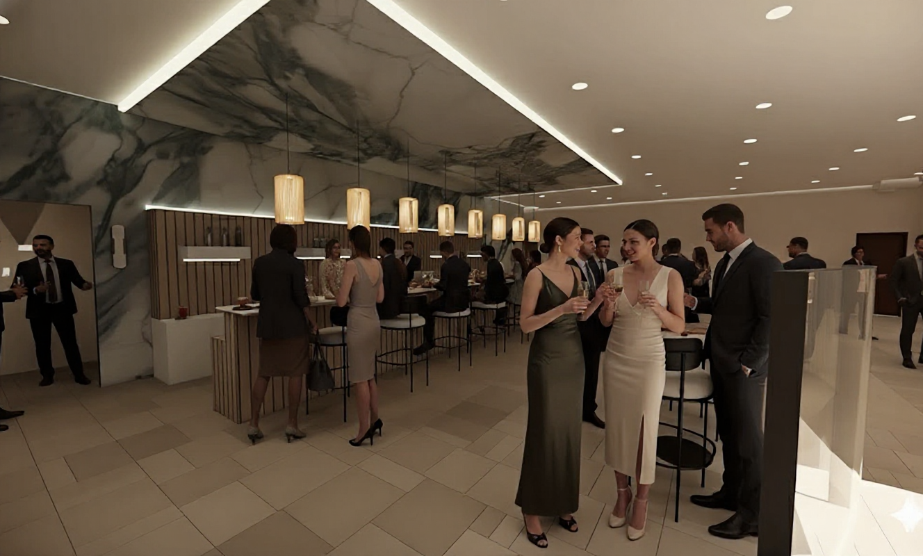 black roof black painted cladding black window frames living room interior furniture interior lights on low timber deck concrete paving trees in background extensive native planting sunset