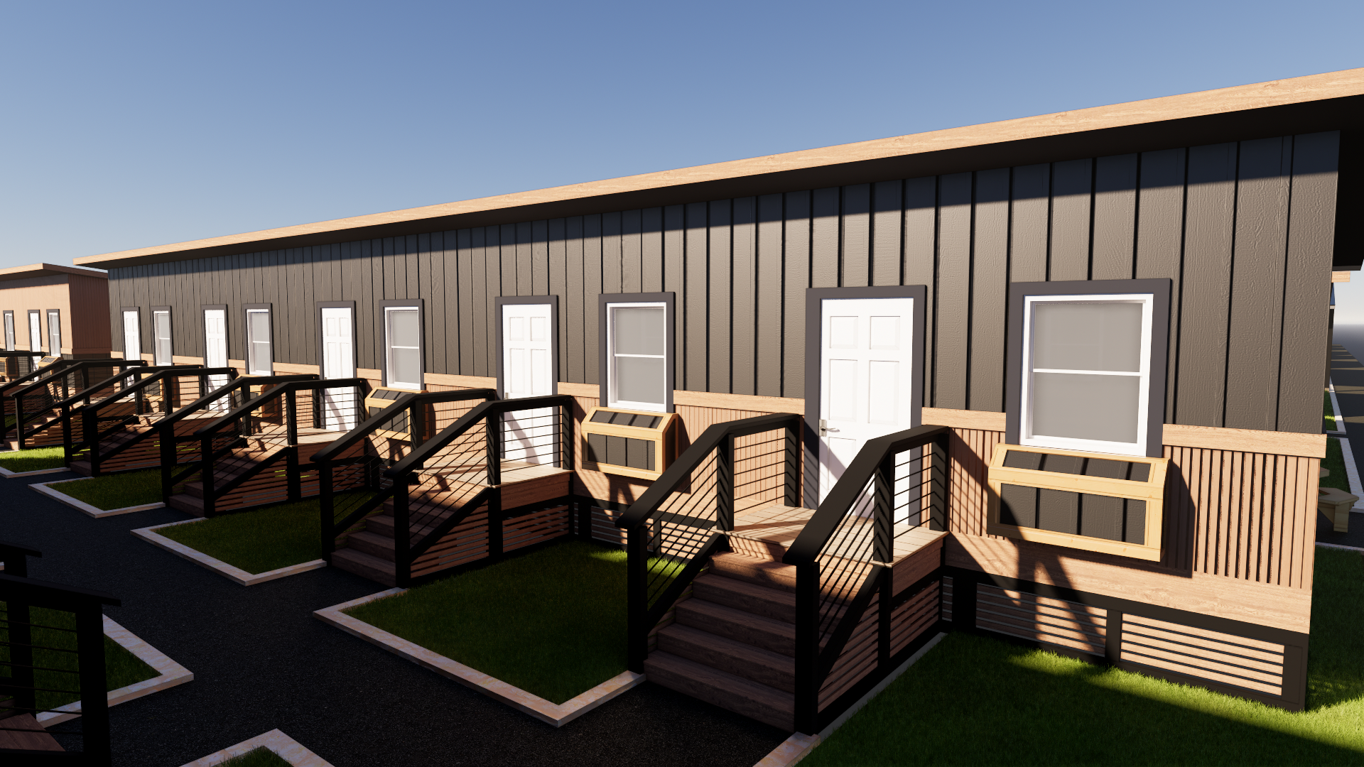 you are a proffessional rendering service working fr a company that is trying to sell the idea of a man camp for public permitting keep all structures exactly as they are keep windows where they are keep doors where they are keep grass where is it and freshly mowed keep black gravel pathways where they are mobile home for a man camp but upscale and classy no trees airplane flying over well kept neat grass black board and batten