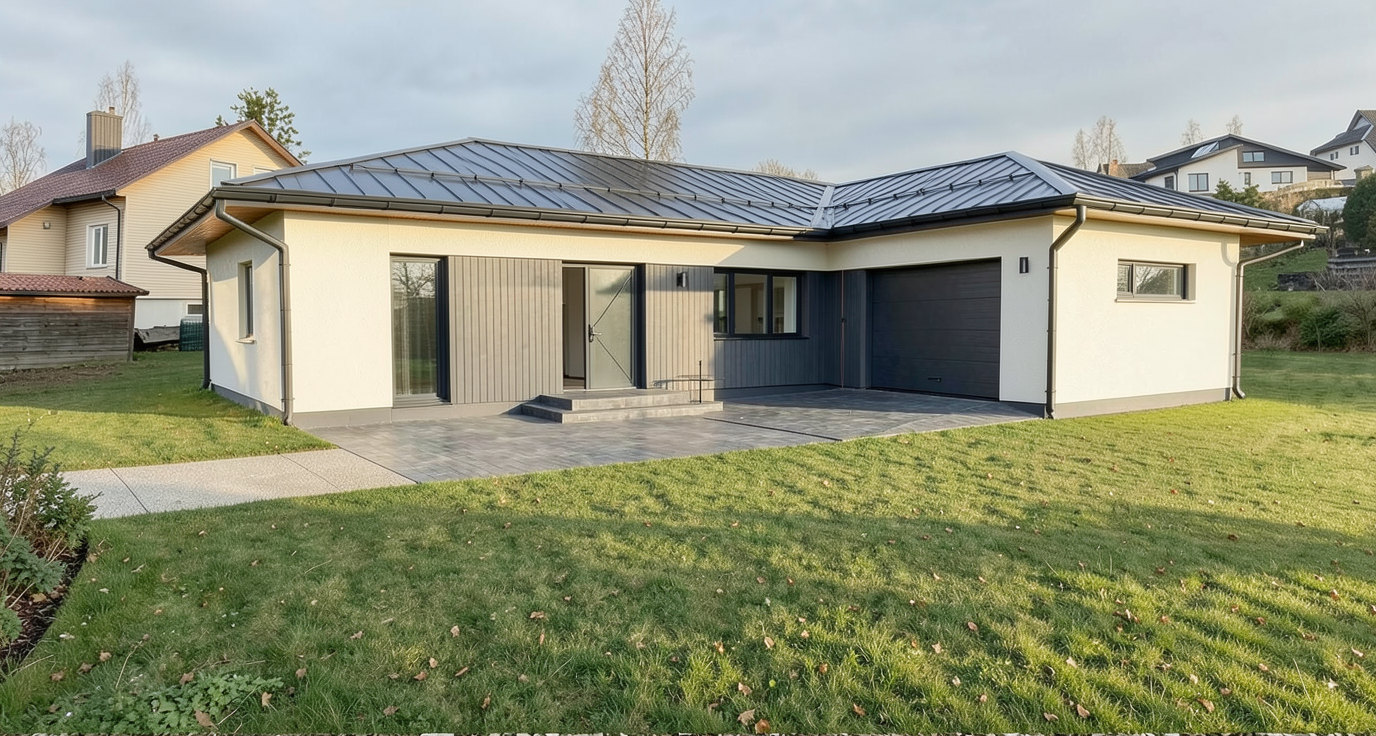 facades light plaster and dark gray wooden panels roof covered with anthracite rukkii classic sheet metal put the car at the main entrance