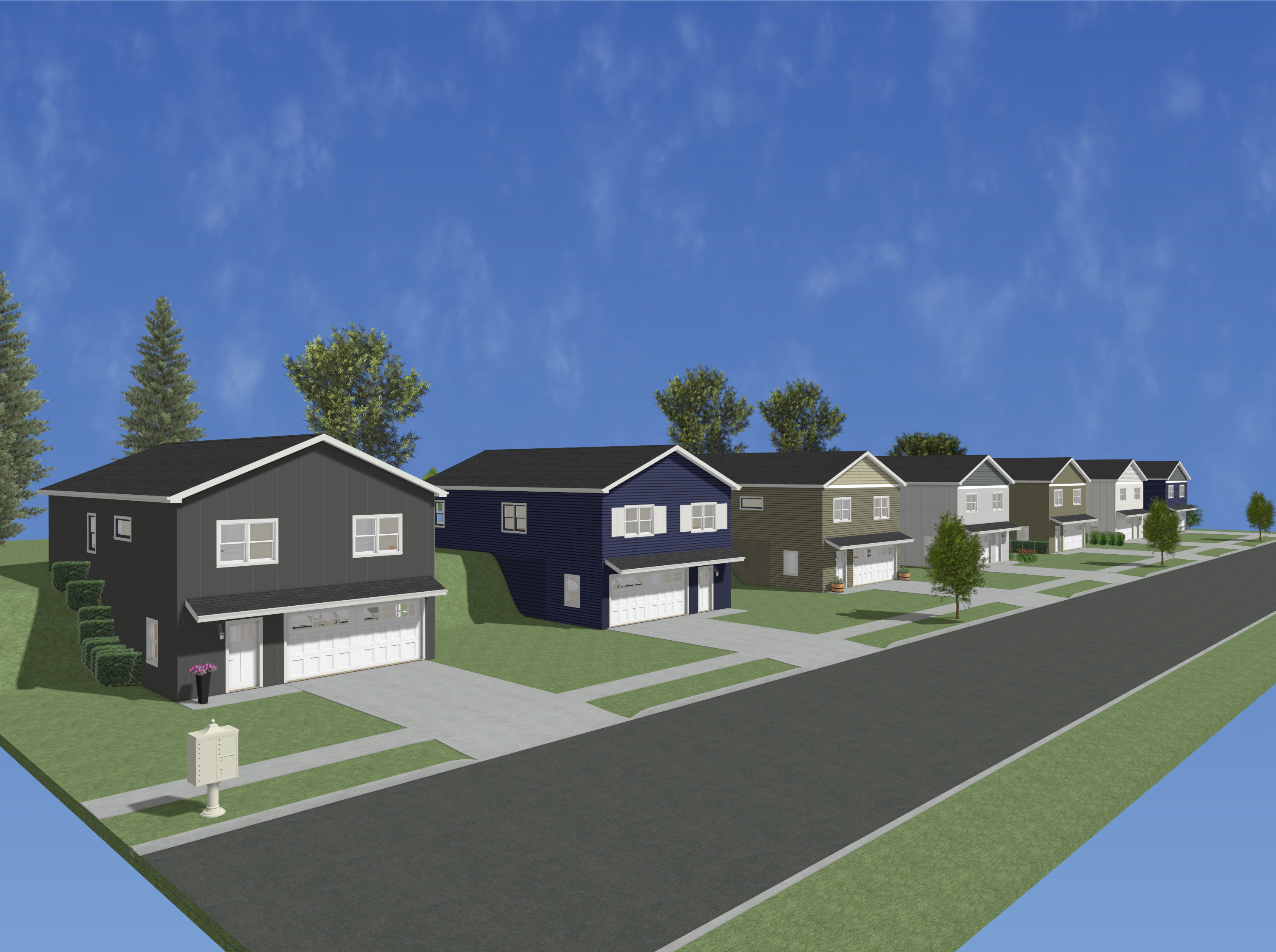 a suburban street with modern two story houses each with a garage on a bright clear day the sky is a vibrant blue with soft wispy clouds the houses are painted in shades of dark gray deep blue and earthy green with crisp white trim around the windows and roofs the grass is a lush vibrant green neatly trimmed the concrete sidewalks and driveways are light gray contrasting subtly with the darker asphalt of the road small well maintained and evenly spaced trees line the street adding a touch of nature to the urban setting the atmosphere is serene and picturesque evoking a sense of peaceful suburban life