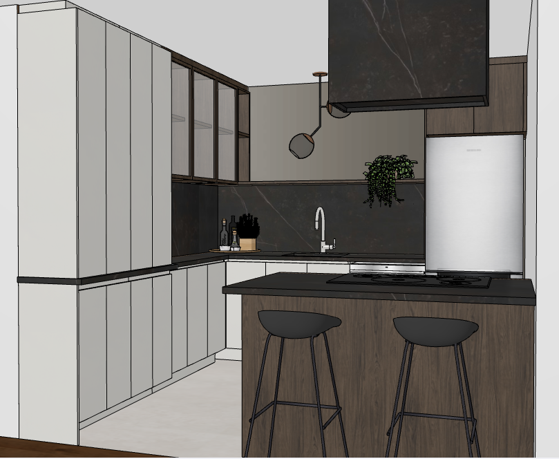 the luminous kitcharmoires are in light beige and dark oak the counters and custum hood are black dekton the backsplash in the bottom is black dekton as well and the top is dark bronze mirror