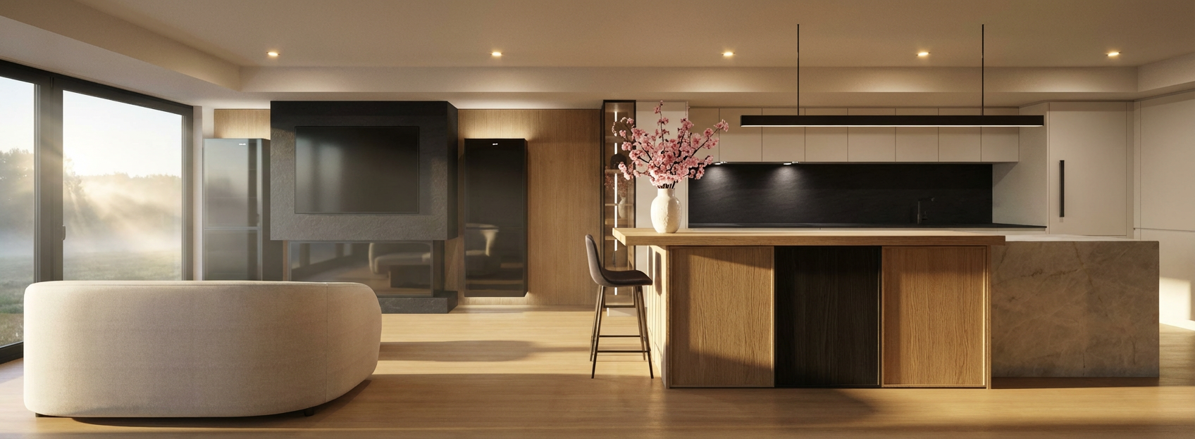 add white vase with cherry blossoms on the island moody light cabinets in white matte flat doors and natural oak do not change cabinets nor add open shelves don t add new cabinets don t add new windows add ceiling spot lights foggy and sunny weather behind the windows barter at the island made out of natural oak