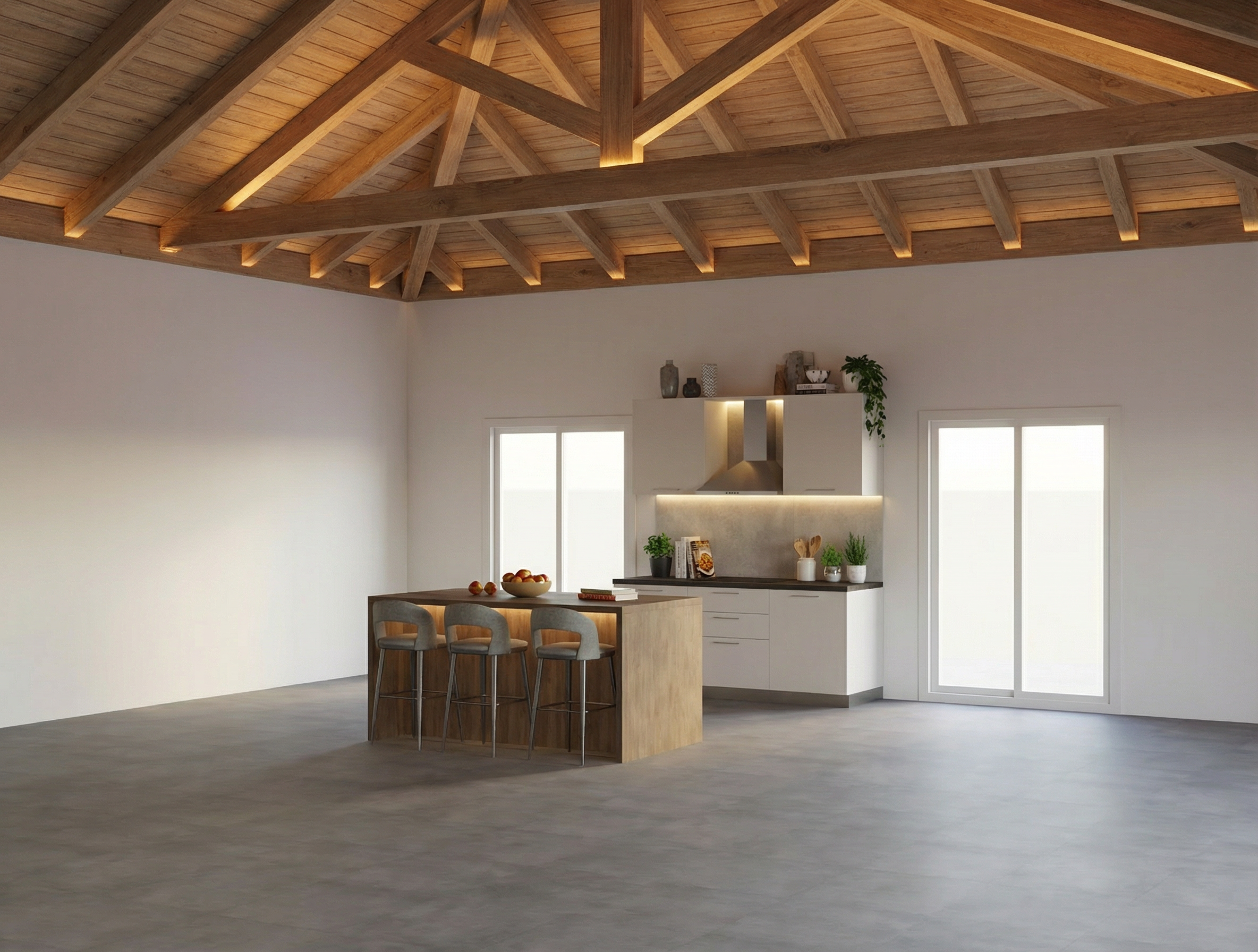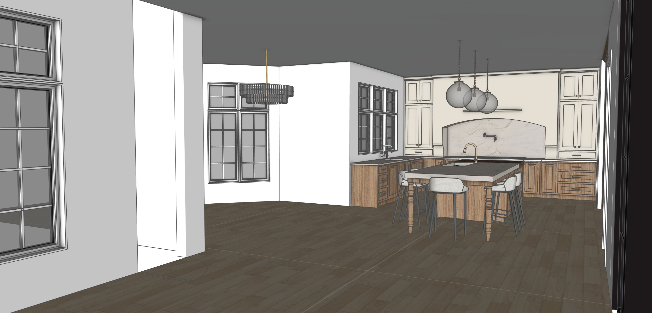 ultra realistic kitchen rendering based on a sketchup model realistic cabinetry materials soft beige painted range hood and hutches crystallo quartzite countertops with subtle veining accurate texture scale white oak floors with subtle wear and color variation matte painted walls with slight texture realistic fabric upholstery with visible weave physically accurate reflections and shadows soft indirect light global illumination professional interior photography crisp edges high detail clean modern aesthetic full frame camera 28mm lens
